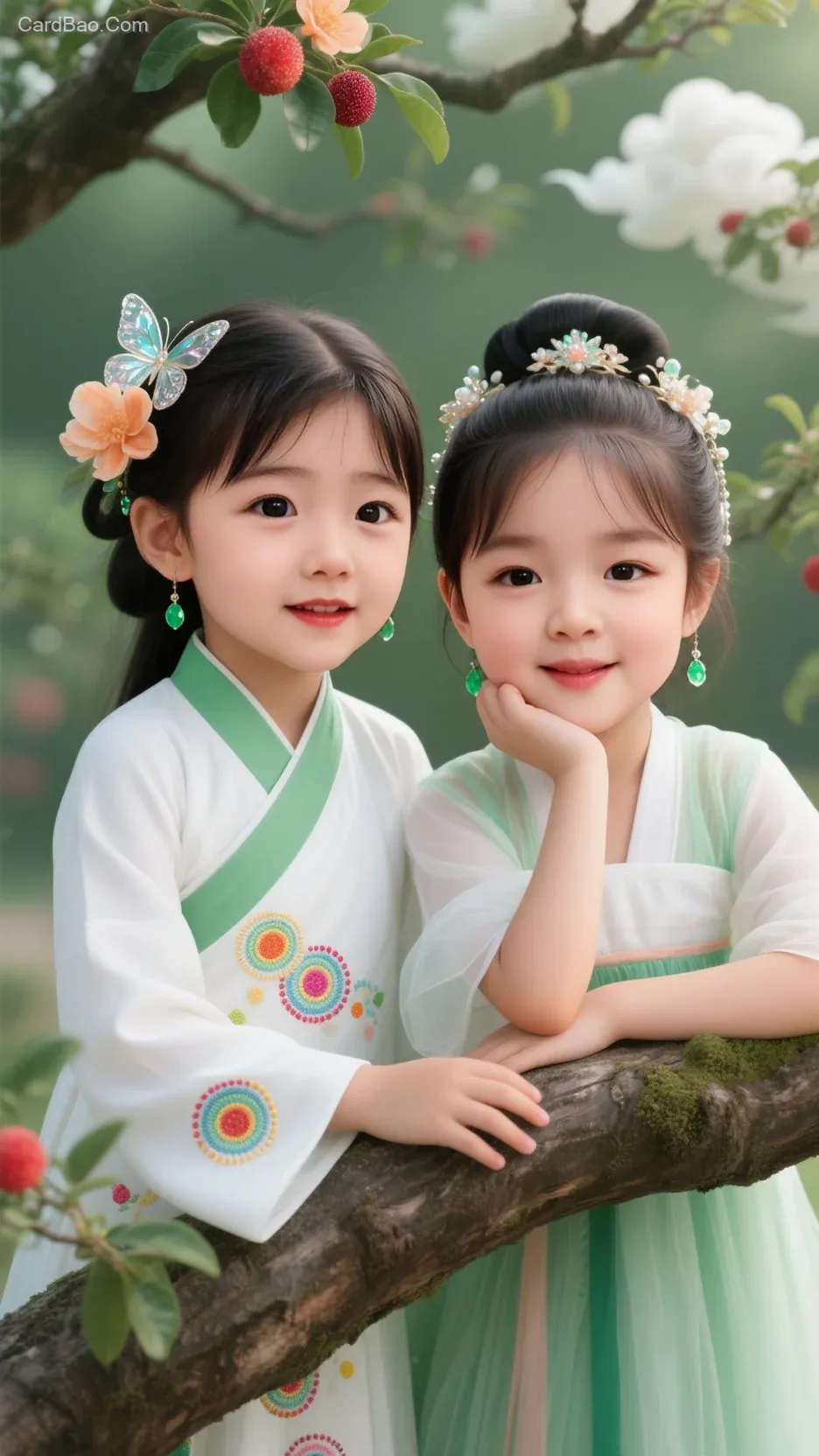#### Waxberry Tree Scene, featuring vibrant and saturated colors, inspired by the Huang Rong character design from the 1983 adaptation of *The Legend of the Condor Heroes*. A young maiden wears a white and soft green gradient cross-collar robe with fitted cuffs, adorned with delicate embroidery on the collar and sleeves. Over this, she dons a light yellow-to-pale green gradient gauze vest embroidered with small classical circular patterns in multicolored silk threads. A fresh green sash cinches her waist. Her hair is styled in a high cloud-like bun, accented at the center with a tiny crystal butterfly hairpin, while her temples are evenly adorned with a row of miniature light orange crystal flowers. Playful short braids frame her face, and her cascading waterfall-like locks are complemented by gemstone earrings that match her outfit. Her lively and mischievous look, paired with the bright and vivid colors of her attire and hair accessories, highlights her cheerful and adorable personality.