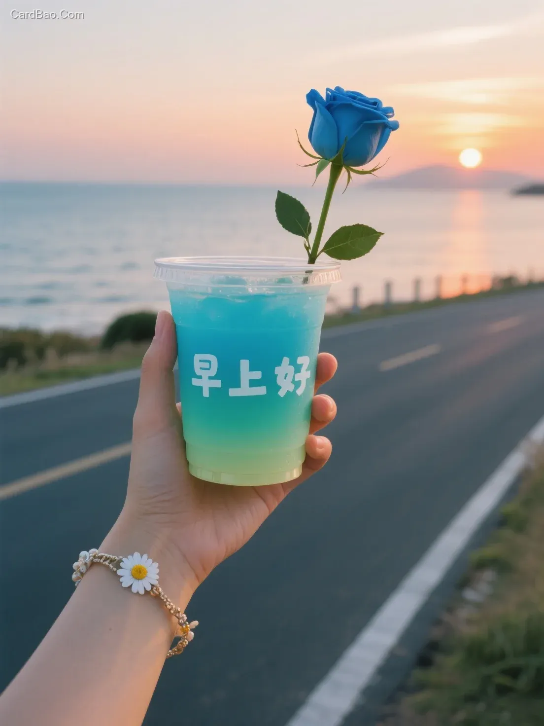 画面呈现一只手拿着一杯渐变蓝绿色、印有“早上好” 文字且杯口插着蓝玫瑰的饮品,手腕戴有雏菊装饰手链,背景是日落时分的道路与海景,整体氛围温馨,色彩清新。