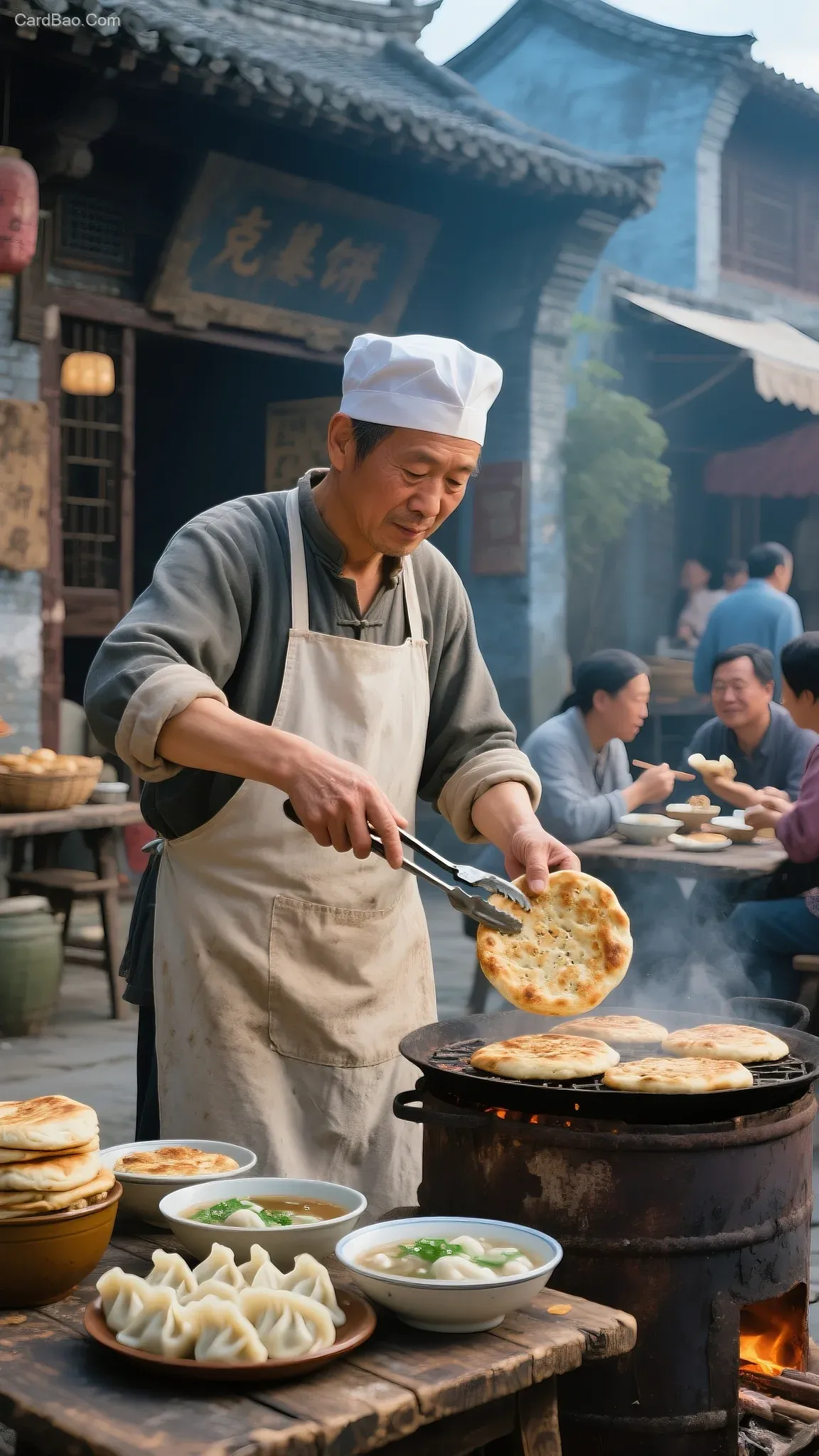 近景,一位非常淳朴的中年人围着围裙戴着卫生帽,在古老的烧饼桶边烤烧饼,手持烧饼钳子做饼烤烧饼桶前制作烧饼,旁边小桌有几个食客正在吃烧饼和酸汤饺子,背景是古老小镇集市的门面,美食场景图,写实风格,突出烧饼,热闹氛围,高清画质32kCg宣染克菜因蓝画面。