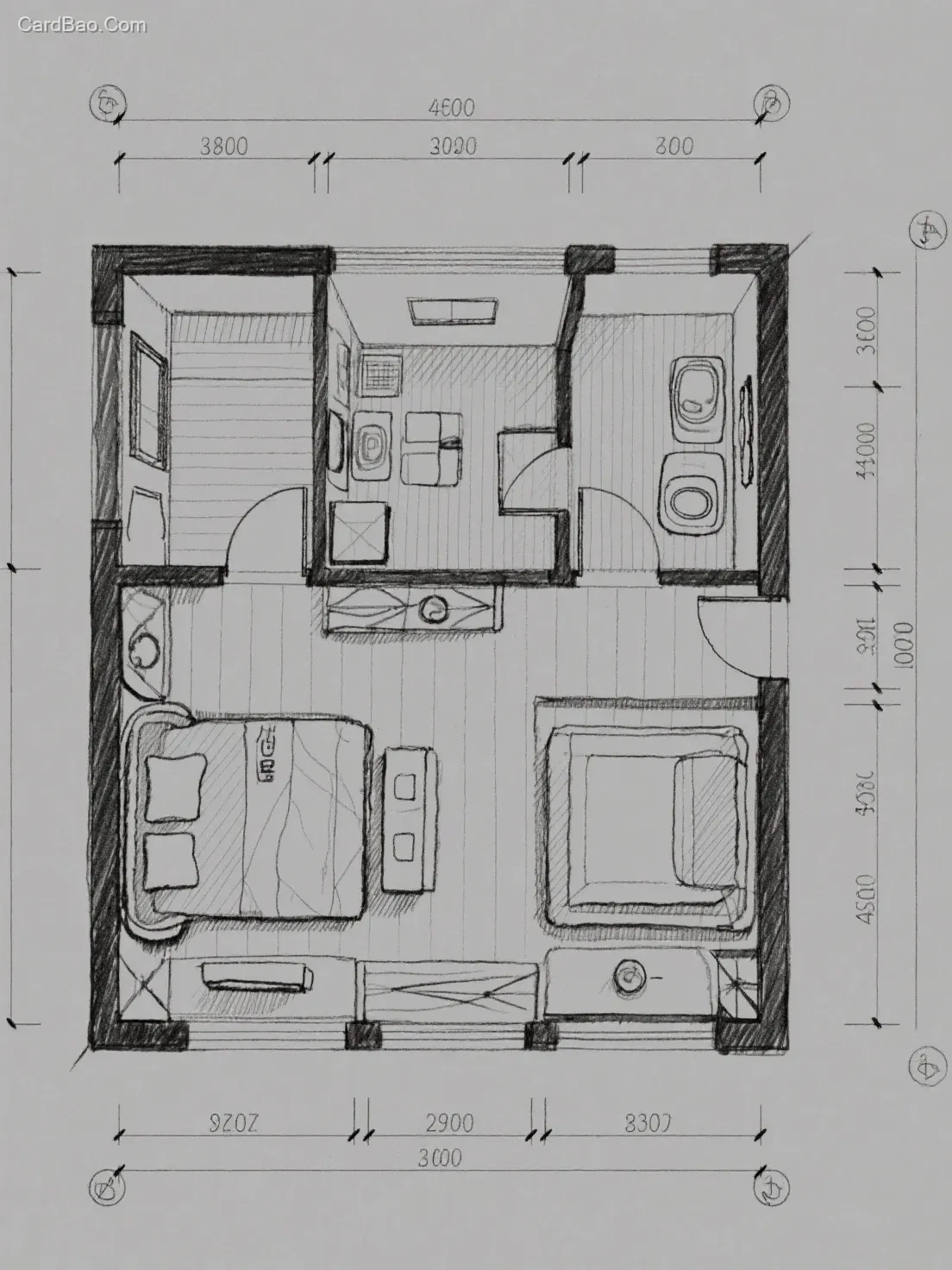 Architectural plan drawing, residential floor plan, one bedroom, one living room, and one bathroom, large public space, requiring line drawing mode, hand drawn style, and dimension annotation