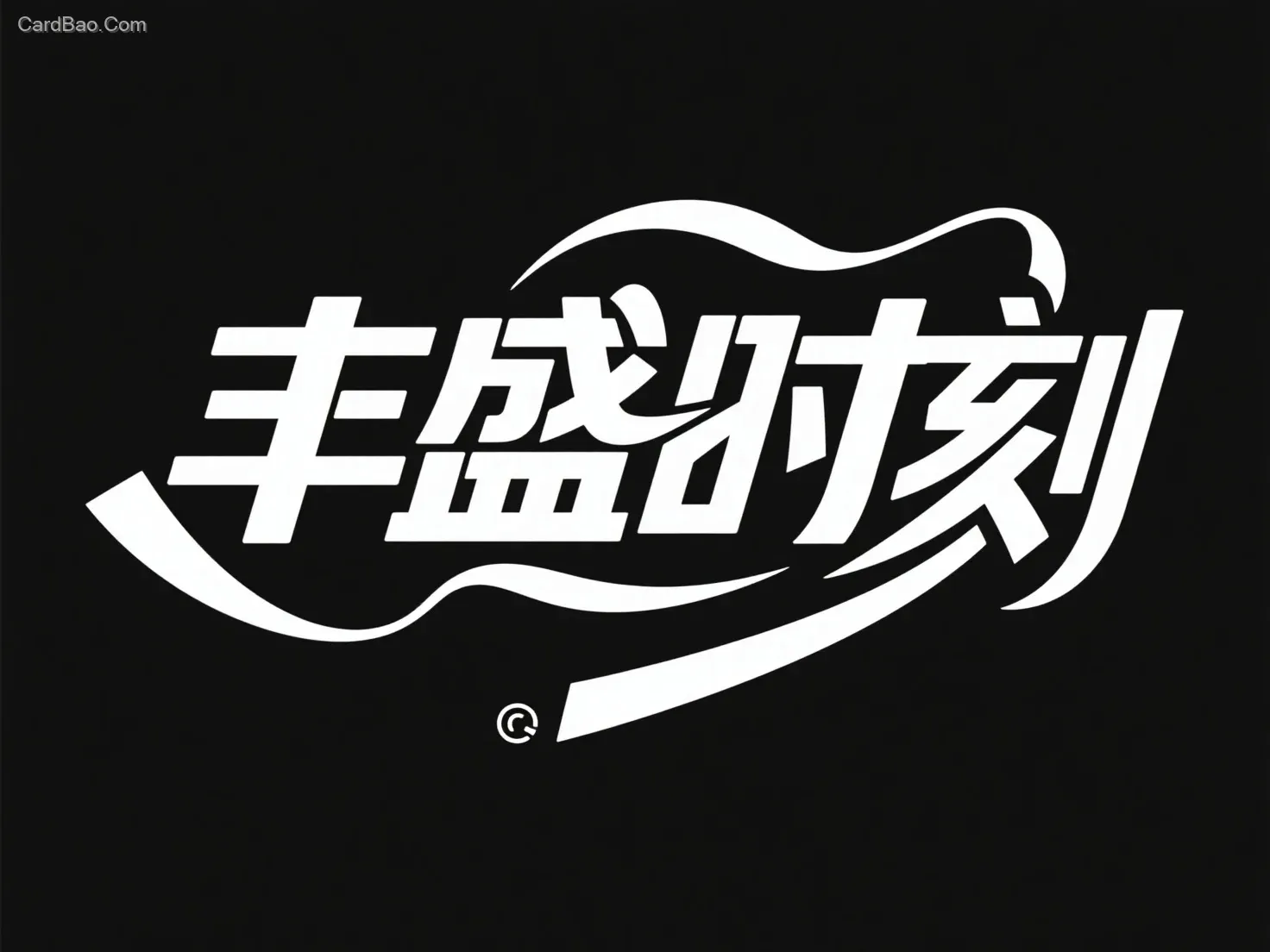 黑底白字,“丰盛时刻” 创作一幅标志风格的字体艺术。字体具潮流现代感,笔画部分灵动弯曲,呈现动态变化。在笔画末端融入时尚装饰元素。