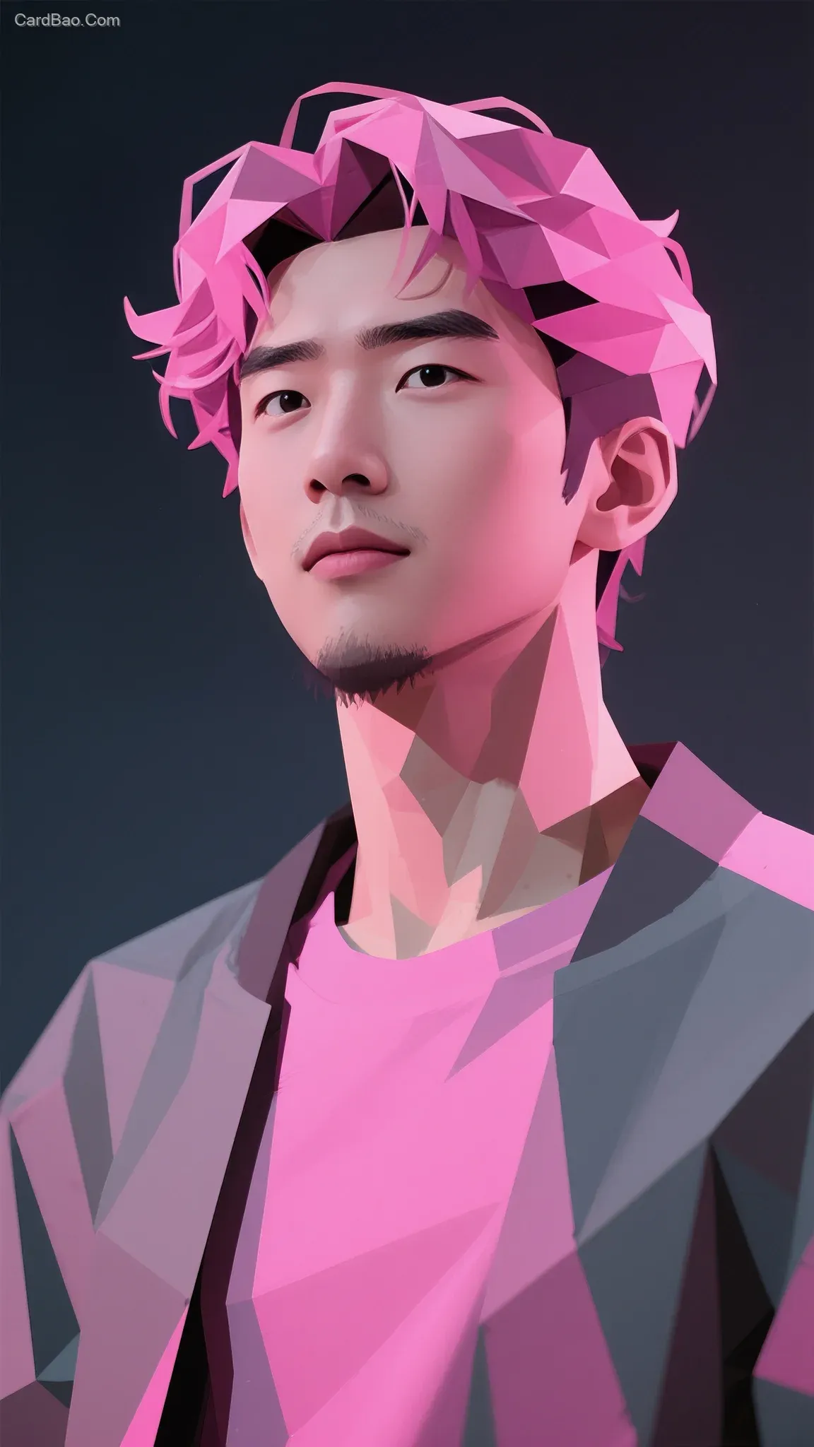 ## A handsome and elegant young man with pink curly hair and a mustache on his upper lip, styled in low-poly modeling with flat angular folds, using color blocks to express volume and strong light/shadow contrasts, giving a video game aesthetic.