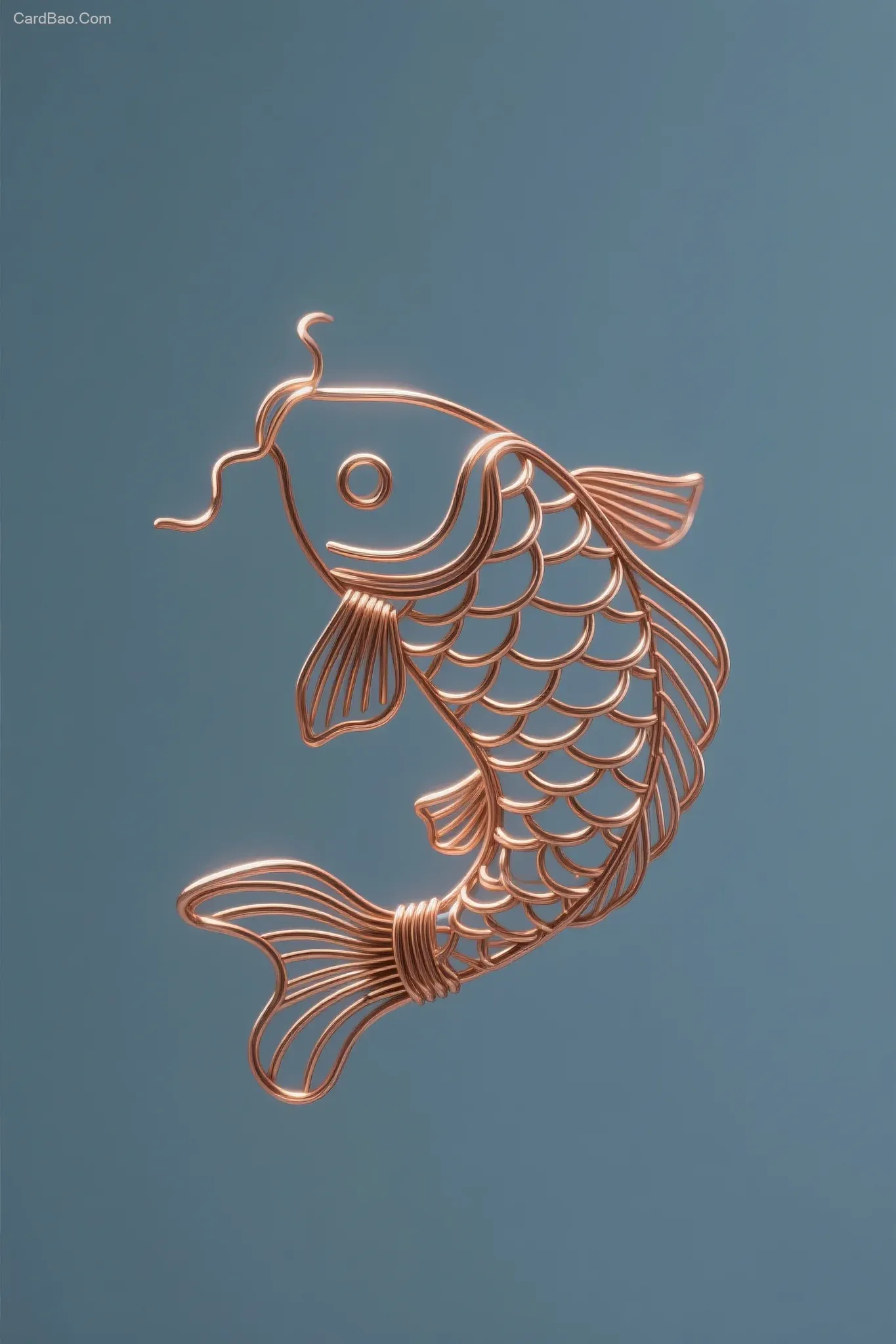 脑洞好物小发明。纯色背景,用铜丝极简抽象绕出一只锦鲤的轮廓,OC渲染铜丝走向,伦勃朗光影交错立体感。