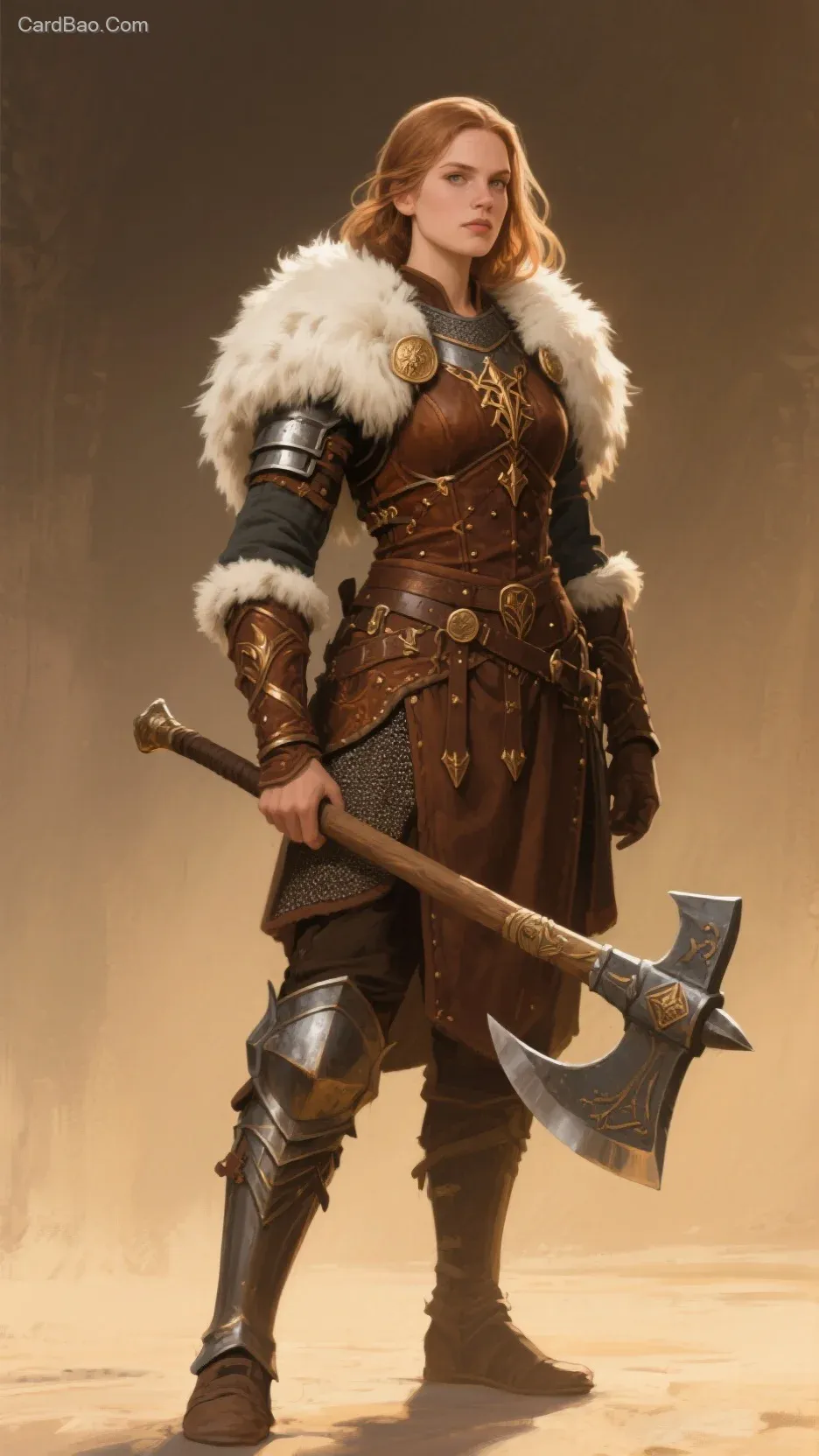 主体: 女性战士身着精致的棕色战甲,带有白色毛领装饰,手持一把大型斧头,站立姿态坚定。