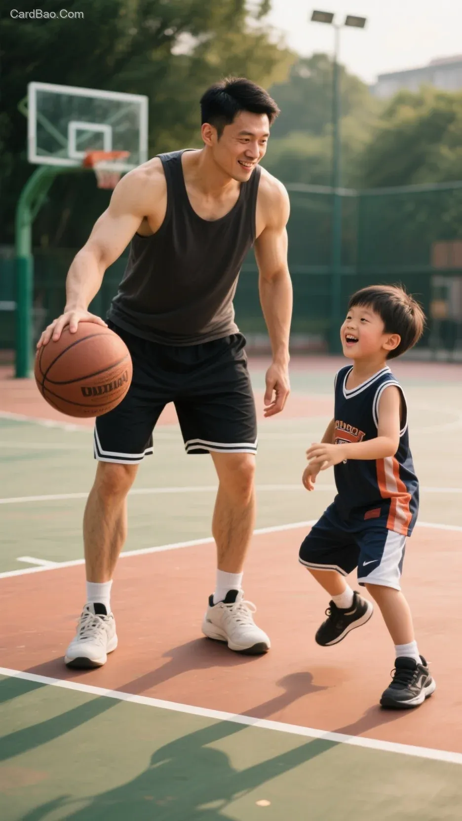 On the basketball court, a father and son are playing basketball. The young Chinese dad is fit and handsome, wearing basketball shorts and a tank top, with long legs and well-developed thigh muscles, along with strong arms. The father looks at his son, who is bright, lively, healthy, and happy, also dressed in a basketball sports outfit. The image is a real-life photograph, a masterpiece by a renowned artist, featuring an "Abao-style" color palette with a film-like texture.