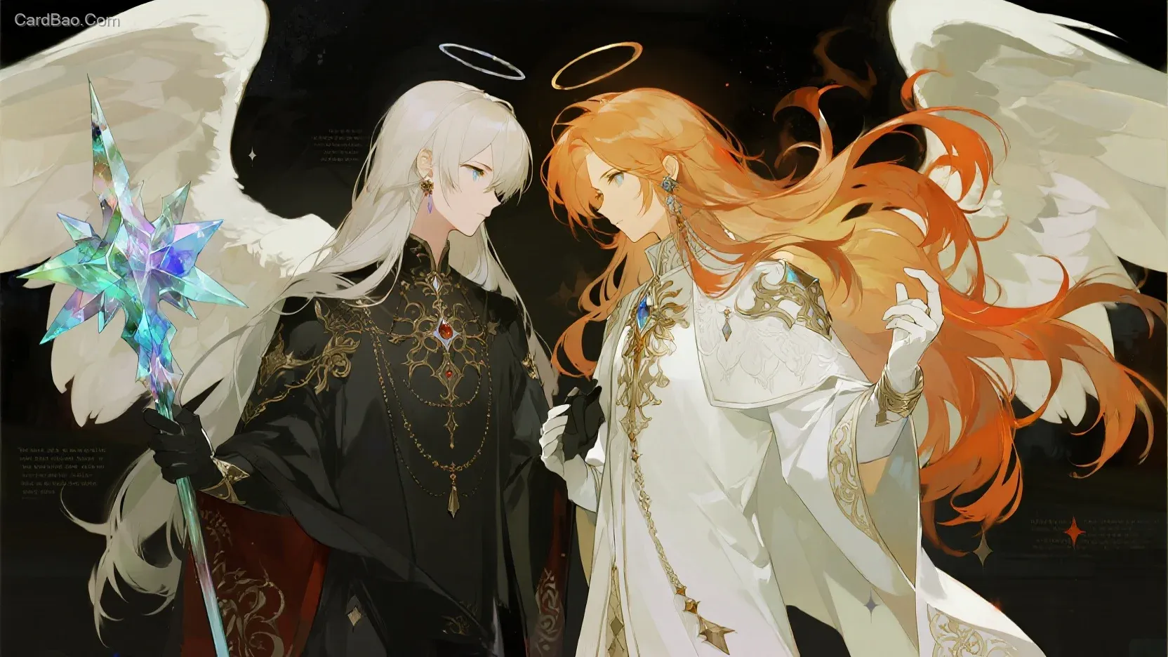 左半边羽翼为琉璃结晶、右半边为燃烧圣焰的堕天使长,圣袍内衬绣着倒转的弥撒经文