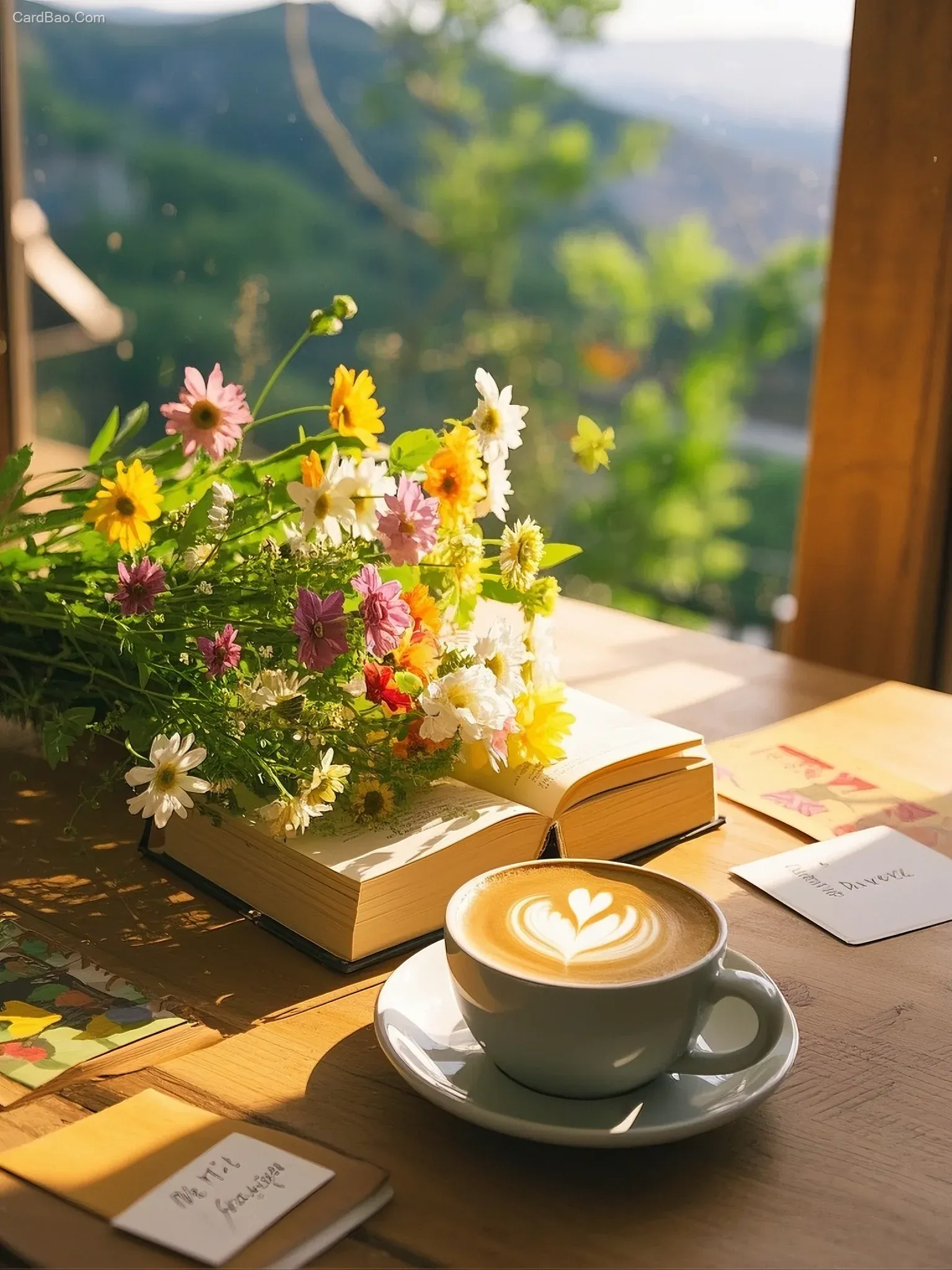 爱心形状拉花的咖啡杯,合上的精装书,斜放五颜六色的小野花花束,阳光从窗户斜射进来,木质桌面摆放着卡片,柔和的晨光形成光斑,浅色调背景轻微虚化,高分辨率摄影,细节清晰,治愈风格,色彩饱和度适中,胶片质感