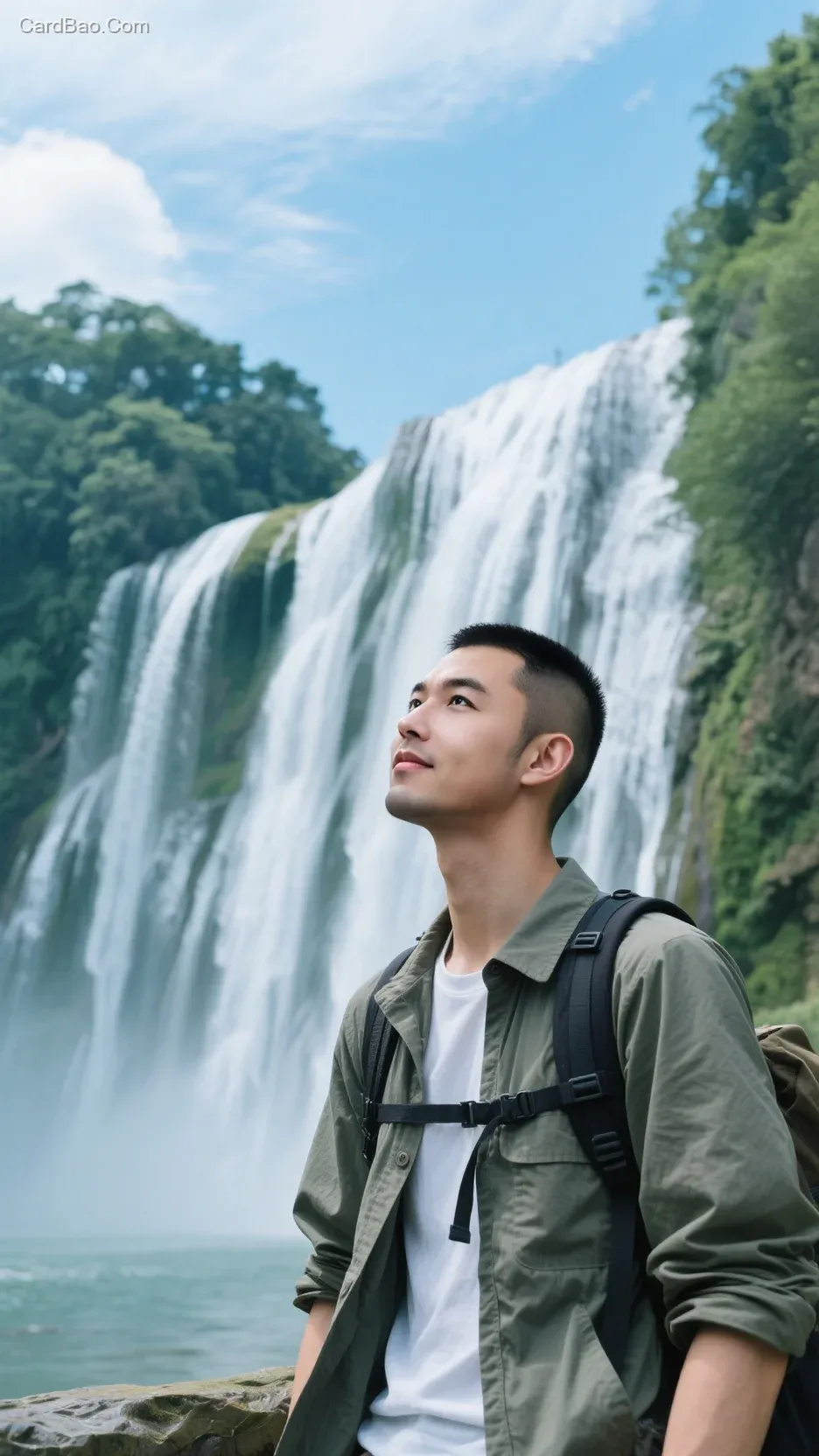 ## A 25-year-old boy with a buzz cut wearing travel attire, with the Huangguoshu Waterfall in Guizhou behind him