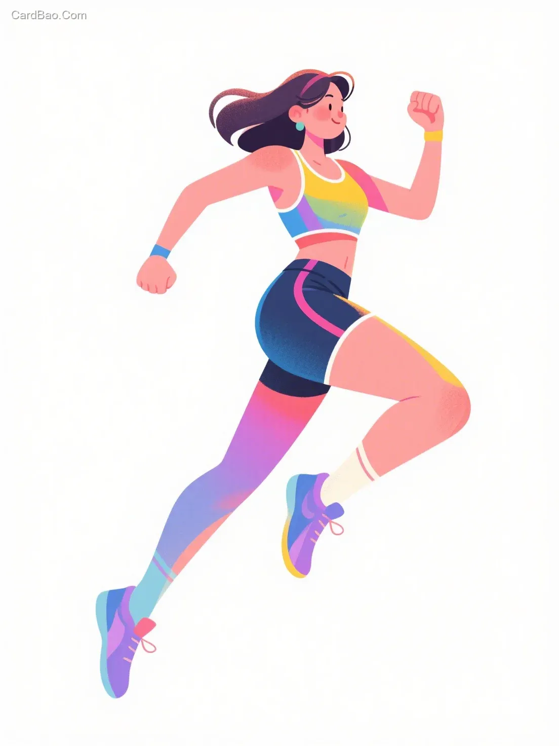 Flat illustration style, popular in major internet companies, young woman, jumping. Sports attire, vibrant colors, flat illustration, soft lighting and shadows, thick brush strokes, white background.