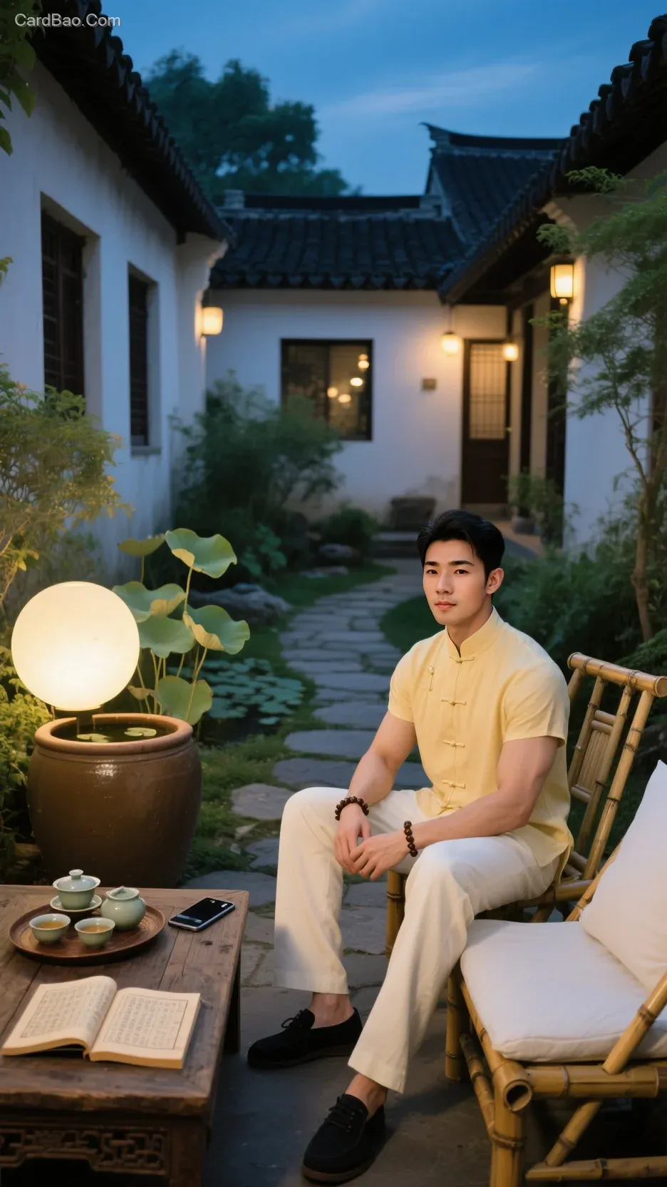 ##夜幕降临,华灯初上。古雅的中式小院,黛瓦白墙在灯光下更显宁静。肌肉男模帅哥,港式盖头发型,穿米黄色短袖唐装衫,不束腰,米白色裤子,黑色布鞋,手手带手串,休闲坐在院孑里,傍边有一古茶桌,桌面上有一套精美茶具,和两本古书,一部华为手机,院中石径蜿蜒,一侧竹椅配着柔软白枕,似在待人落座休憩。巨大陶缸里,浮着圆润灯球与片片荷叶,微光摇曳。四周绿植错落,于光影中勾勒出自然的生机。在这里,远离城市喧嚣,时光慢流,每一处都诉说着闲适与诗意 。