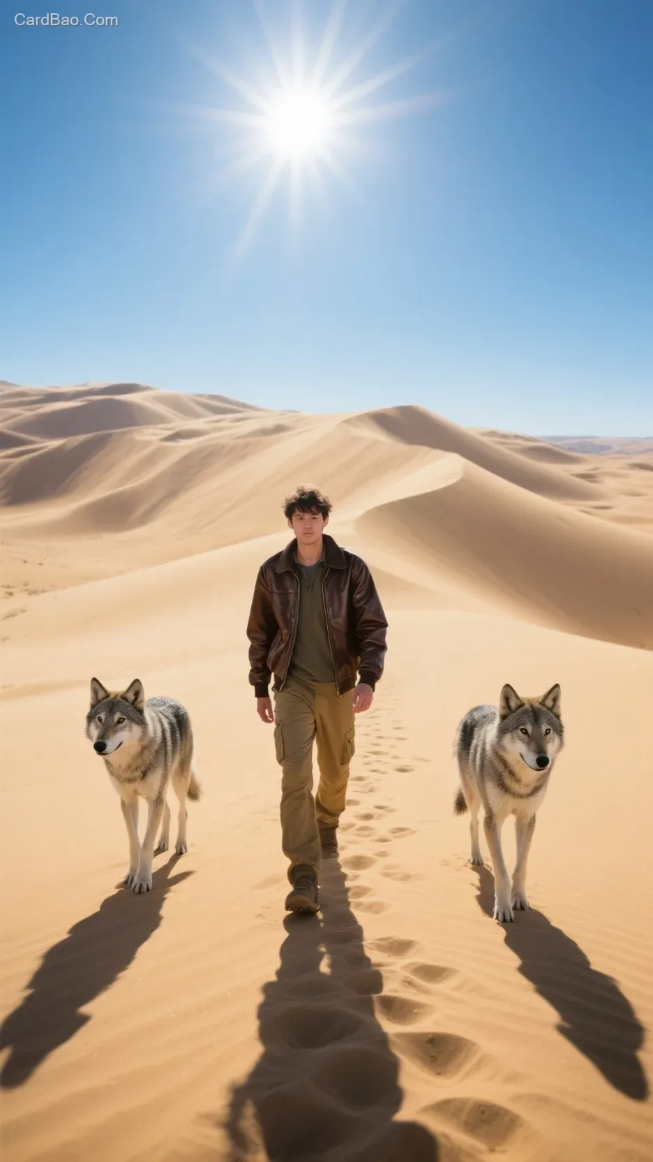 广袤无垠的沙漠,连绵起伏的巨大金色沙丘,强烈阳光,万里无云的湛蓝天空,热浪扭曲空气。一位年轻的探险者(约20-25岁,面容坚毅略带风霜,穿着耐磨的深棕色皮质夹克和卡其裤)正徒步行走。在他左右两侧,稍靠后一步的位置,分别行走着一匹成年灰狼(左)和一匹成年草原狼(右)。灰狼昂首警惕,草原狼目光锐利扫视远方。三者保持沉默的默契,在巨大沙丘上留下长长的足迹。镜头