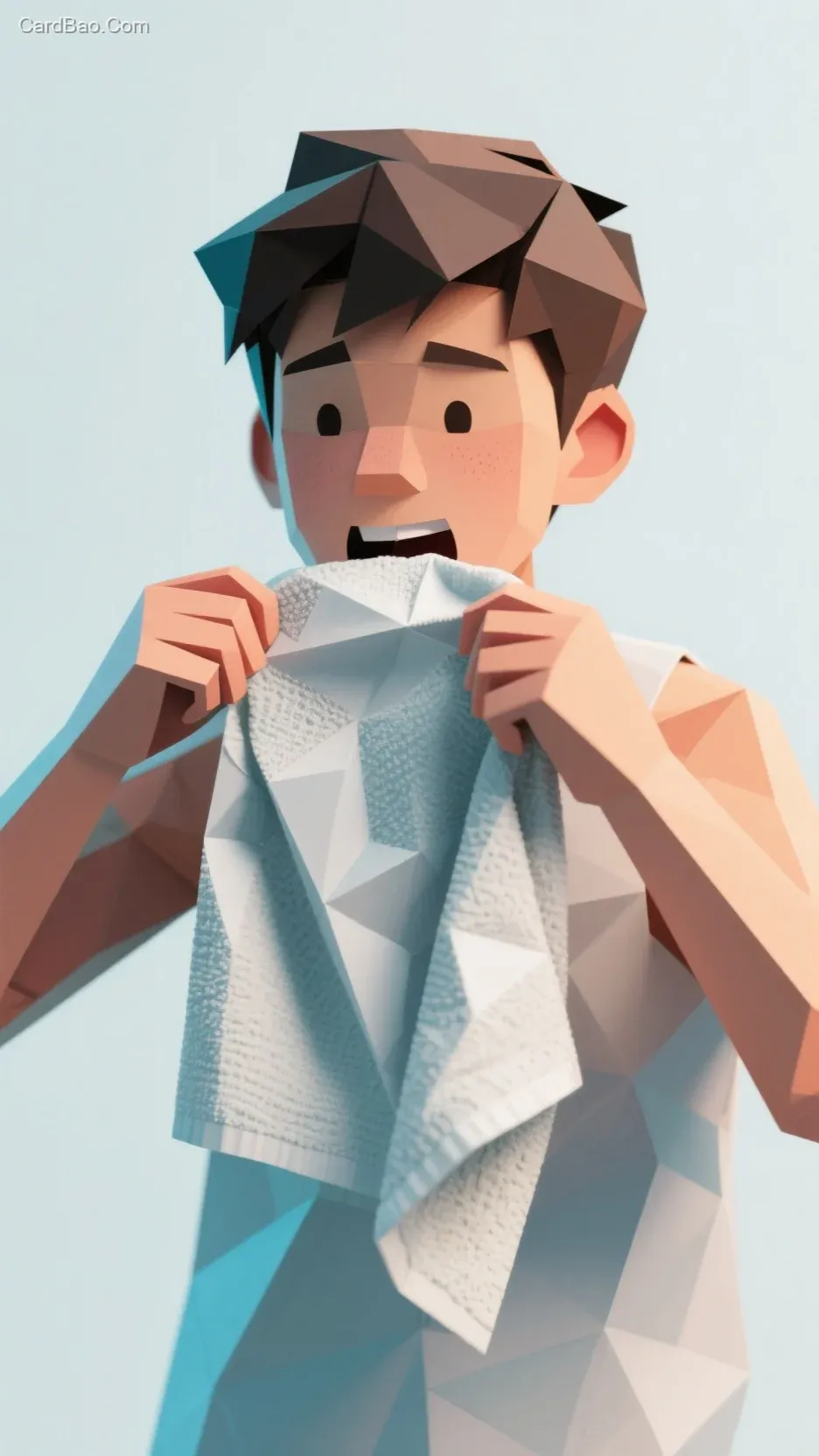 一个小伙这双手拿着毛巾放进嘴里啃,折纸风格,纸张层次丰富,动作多样,表情丰富,色彩鲜艳,立体动作,以独特姿势呈现,褶皱肌理,带点纸张纹理质感,干净背景,16K分辨率