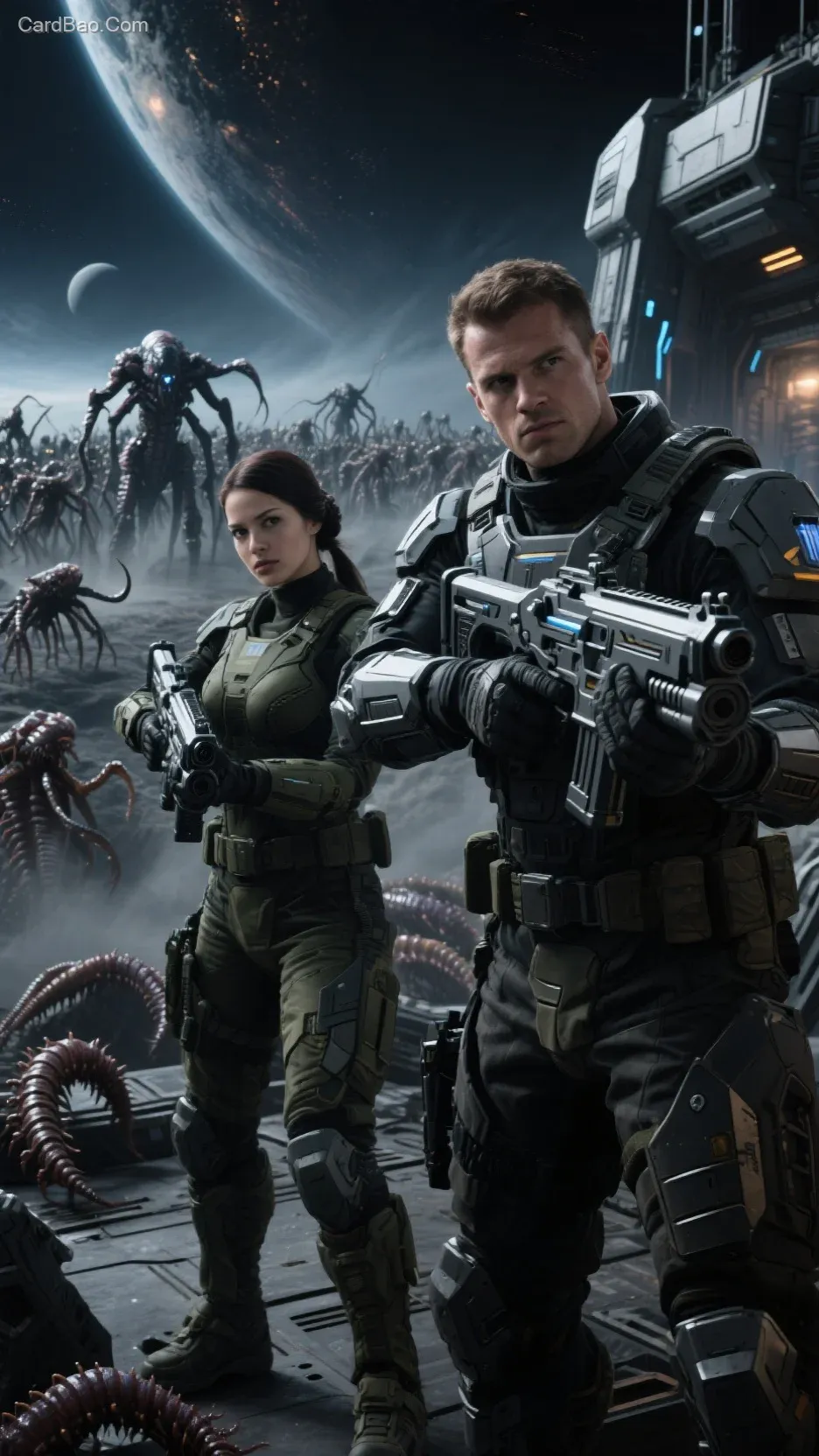 星际争霸里的人类男、女士兵,全身太空科技装备整齐,手持高科技武器,面向虫群准备射击的姿态,守卫着人类基地,远处有虫族的大军进攻了过来,科技感十足,背景外星球,星际感,窒息感,暗黑风。真人实景拍摄,细节丰富,超清,超细节,高清渲染,细腻画质,最高画质。