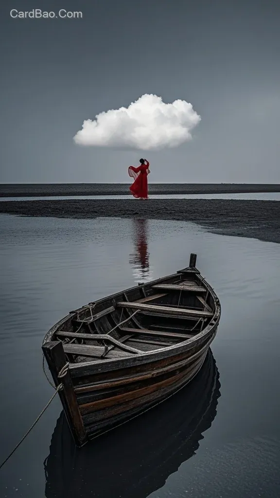 A seaside scene with a gray-toned sky where a single white cloud floats, the sea surface mirror-like, and an ancient wooden boat rests quietly on the water. In the distance, a figure in a long red chiffon dress dances alone on the shore, their silhouette solitary. The 8K ultra-high-definition quality meticulously captures the subtle ripples on the water, the textured grain of the wooden boat, and the sharp contours of the figure, with strong contrasts between light and dark tones. This creates a tranquil yet slightly melancholic atmosphere, where every detail is vividly discernible, showcasing the depth and artistic conception of the composition.
