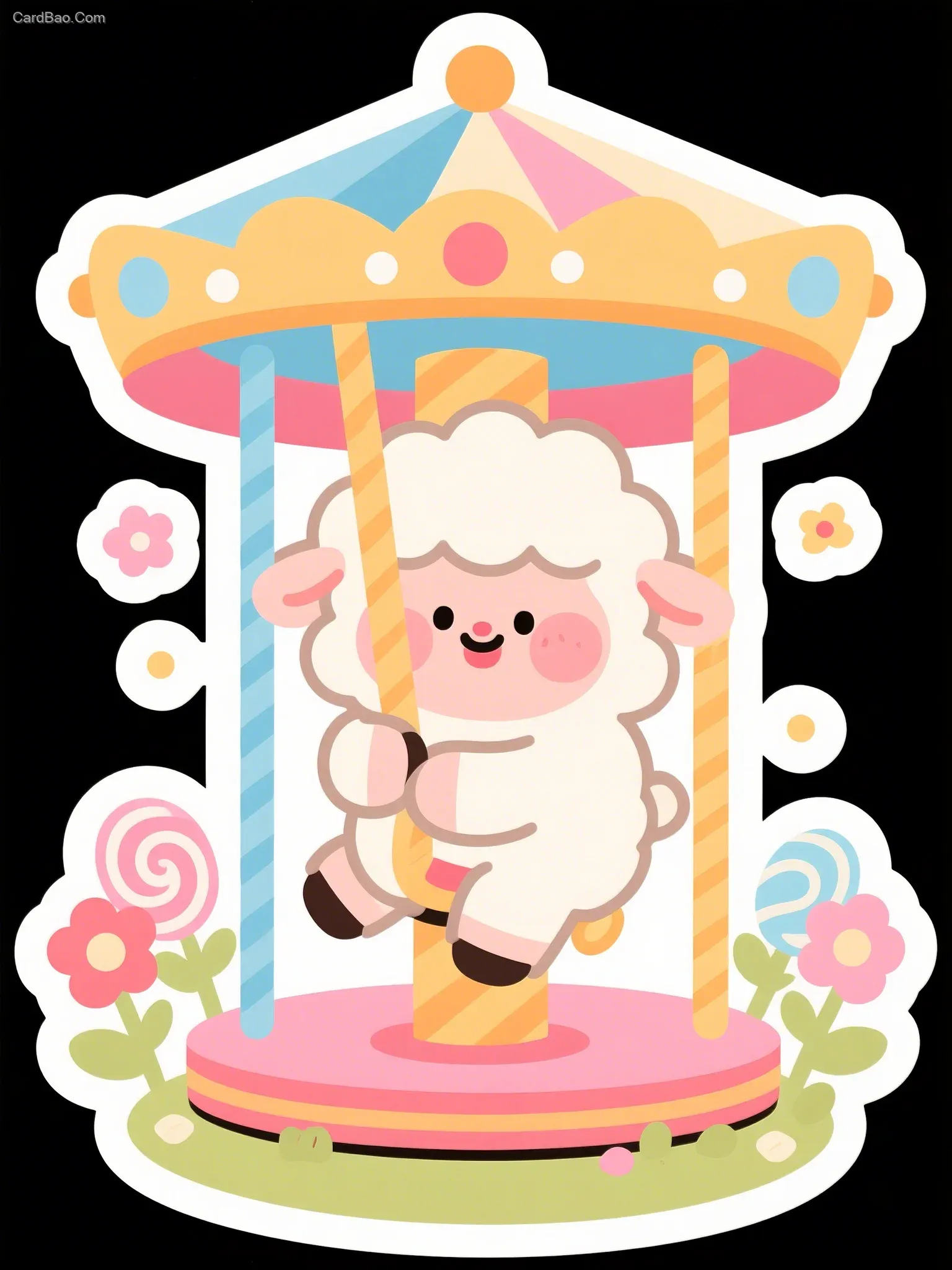 完整的贴纸设计,矢量图,可爱的胖羊宝宝在旋转木马上玩耍,小羊宝宝,萌萌哒的小羊宝宝,十分可爱,萌萌哒的羊宝宝,周围有花,糖果配色,阿宝色系,矢量图,平面设计,贴纸风格,干净画面,明亮画面,明亮色调,暖色调,高清画面,高分辨率