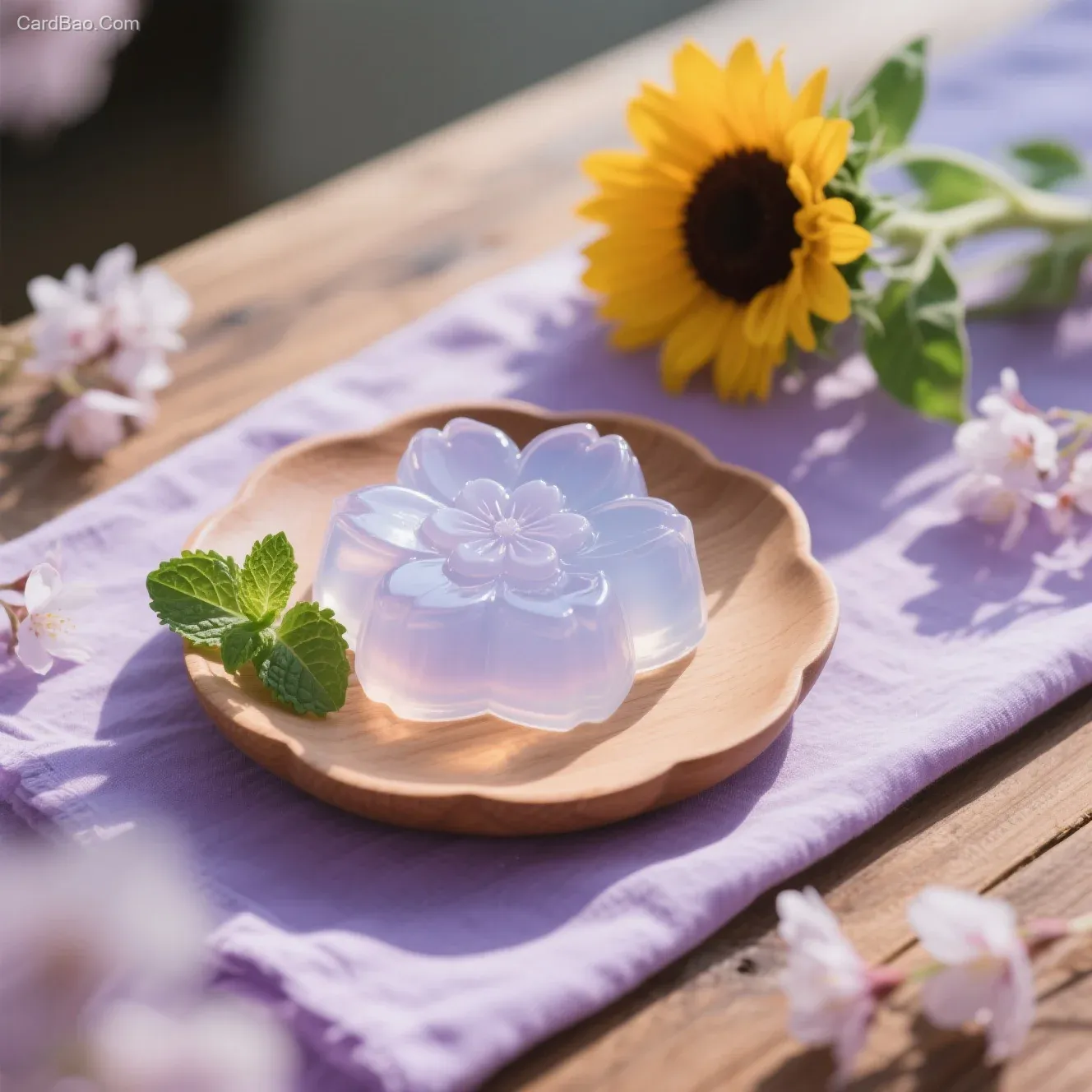帮我生成图片:写实摄影风格,透明质感的樱花造型果冻放在铺有浅紫色餐布的木桌上,莲花形木质托盘、薄荷叶和向日葵花环绕,逆光勾勒出果冻的轮廓,光影朦胧,青紫色调,侧逆光视角,营造出浪漫清新的氛围。比例 4:3。