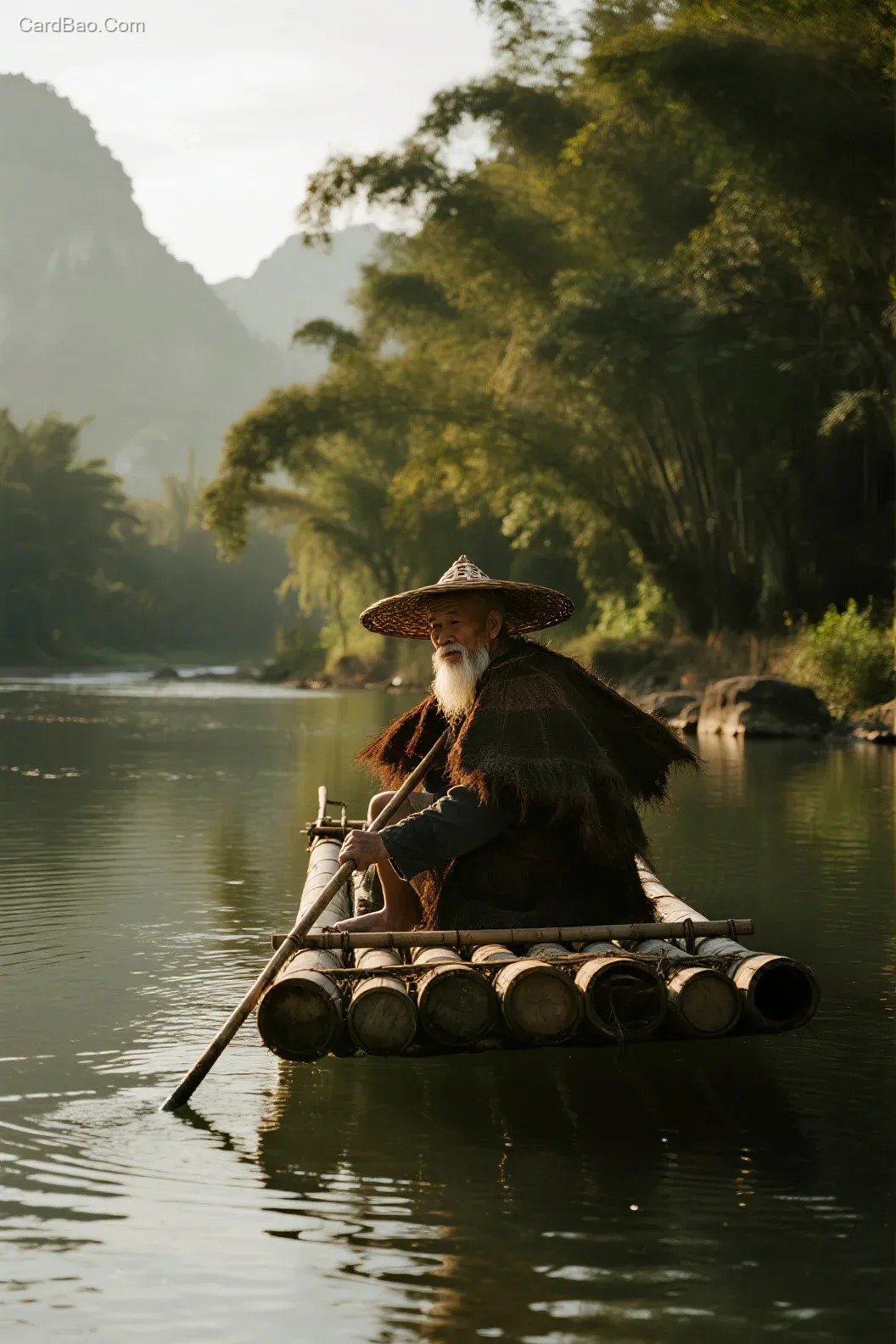 A bamboo raft floats on a mountain stream, with an elderly man sporting a white beard, wearing a conical hat and a straw rain cape, sitting at the edge of the raft or poling with a long bamboo pole. The surroundings are lush trees and riverside rocks. Soft morning or twilight light bathes the water and the man, creating a shimmering surface. The mountain valley background is softly blurred, with reflections visible. Shot from a low angle, in a distant view, with masterful composition, gentle lighting, high resolution, and natural illumination—an 8K ultra-HD photographic masterpiece.