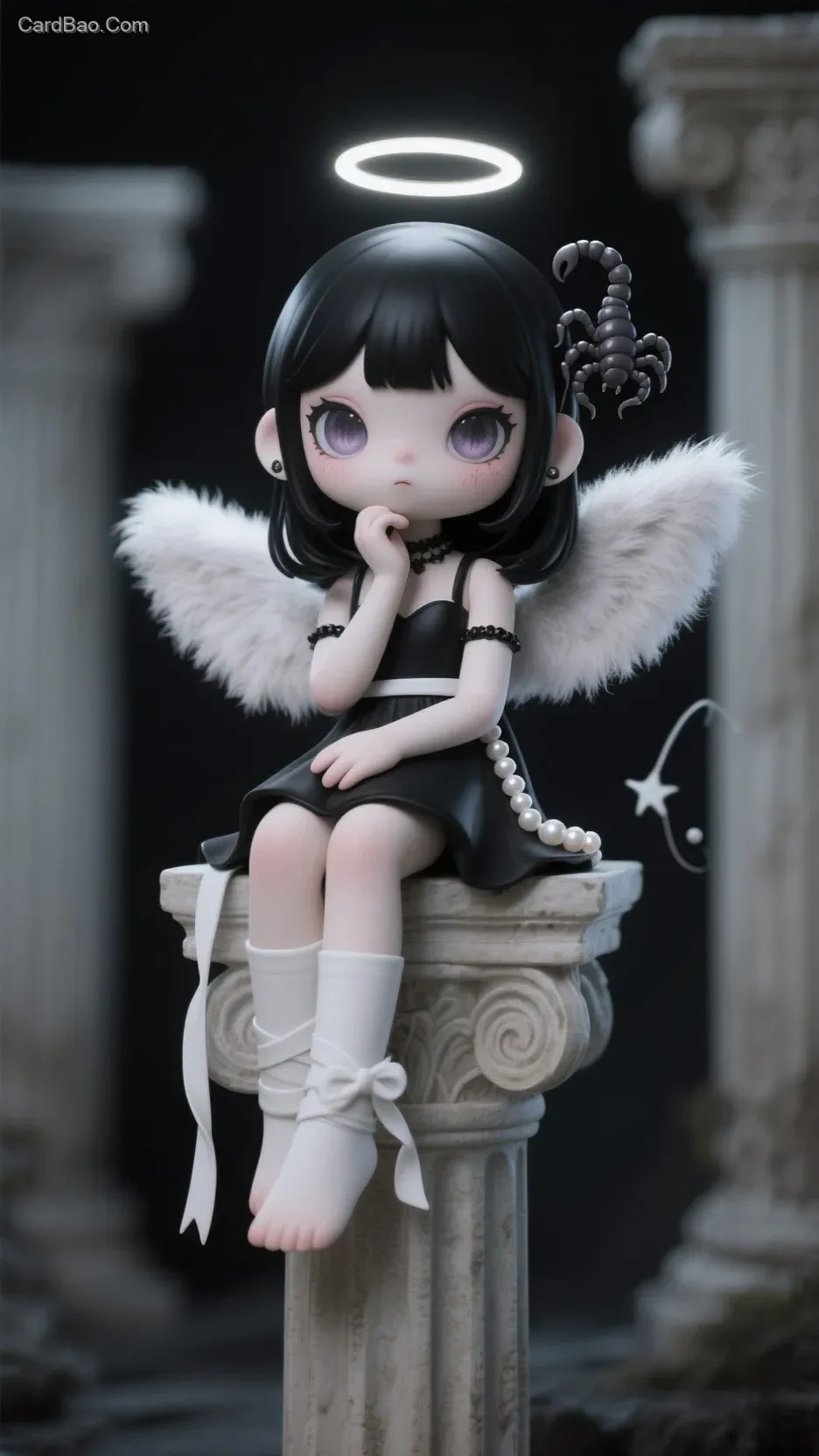 迷幻瞳色,黑发女孩,天使光环,天蝎座,立体感,全身,Q版,希腊风,松弛,毛茸茸天使翅膀,可爱,酷,立体人偶,坐在罗马柱上,沉思,松弛,白的丝带绑分别绑在两条小腿上,优雅,恐怖童话,病娇,人物泛光,朦胧,肌理感,珍珠粉末感,高冷,冷漠,傲慢,梦幻感,干净极简,黑色背景,高清,诡异美感,怪诞美学,暗黑,磨砂肌理绘画,精致,高级,极致的光影和细节