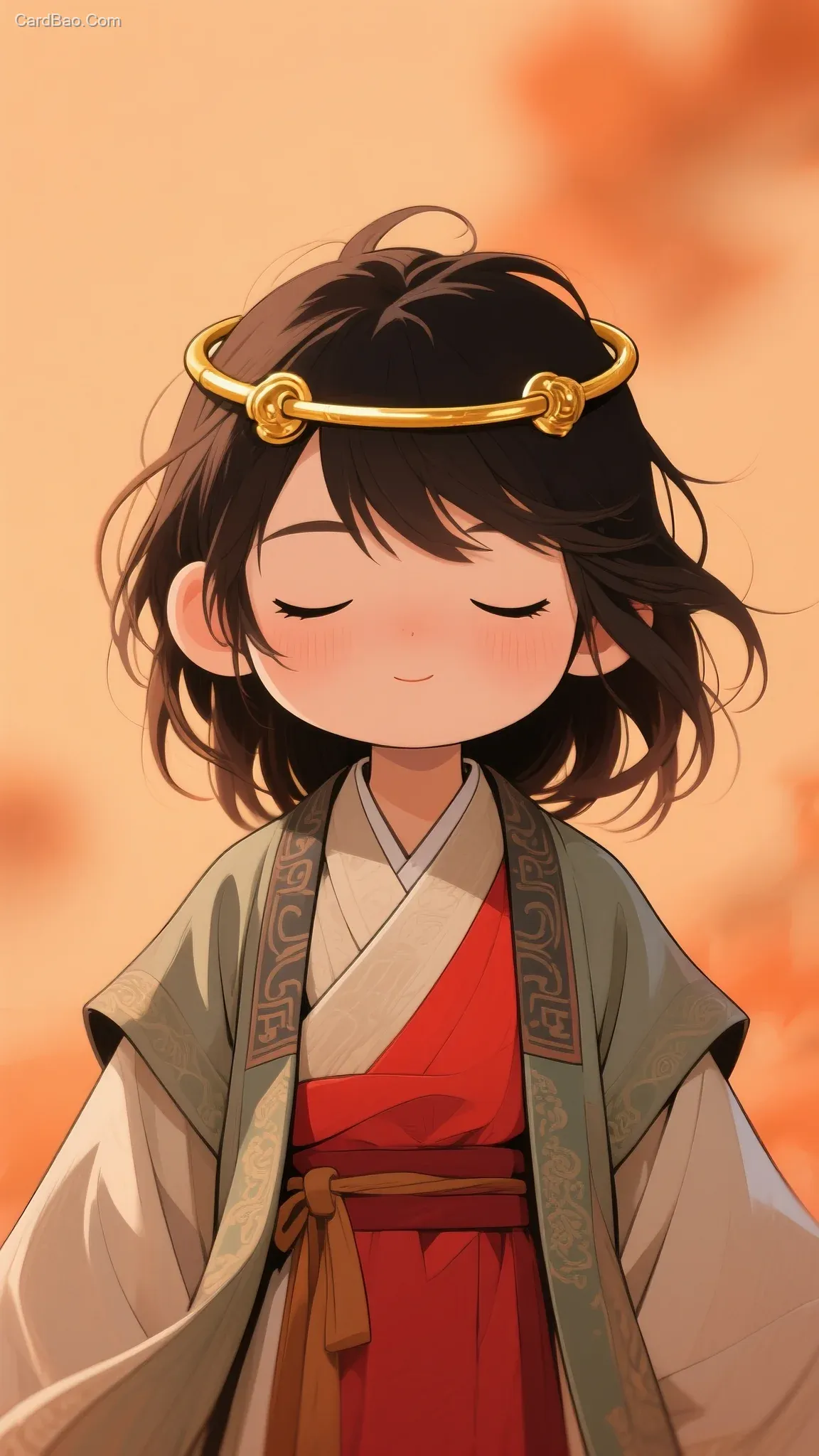 香港漫画风格。形象融合《大话西游》中至尊宝元素(金箍、古装服饰),人物闭眼、散乱的长发,身着中式传统布衣(外袍、里衣分层)内搭红色衣服,背景为暖橙色朦胧效果,营造出宁静、带有故事感的氛围 。Q版。