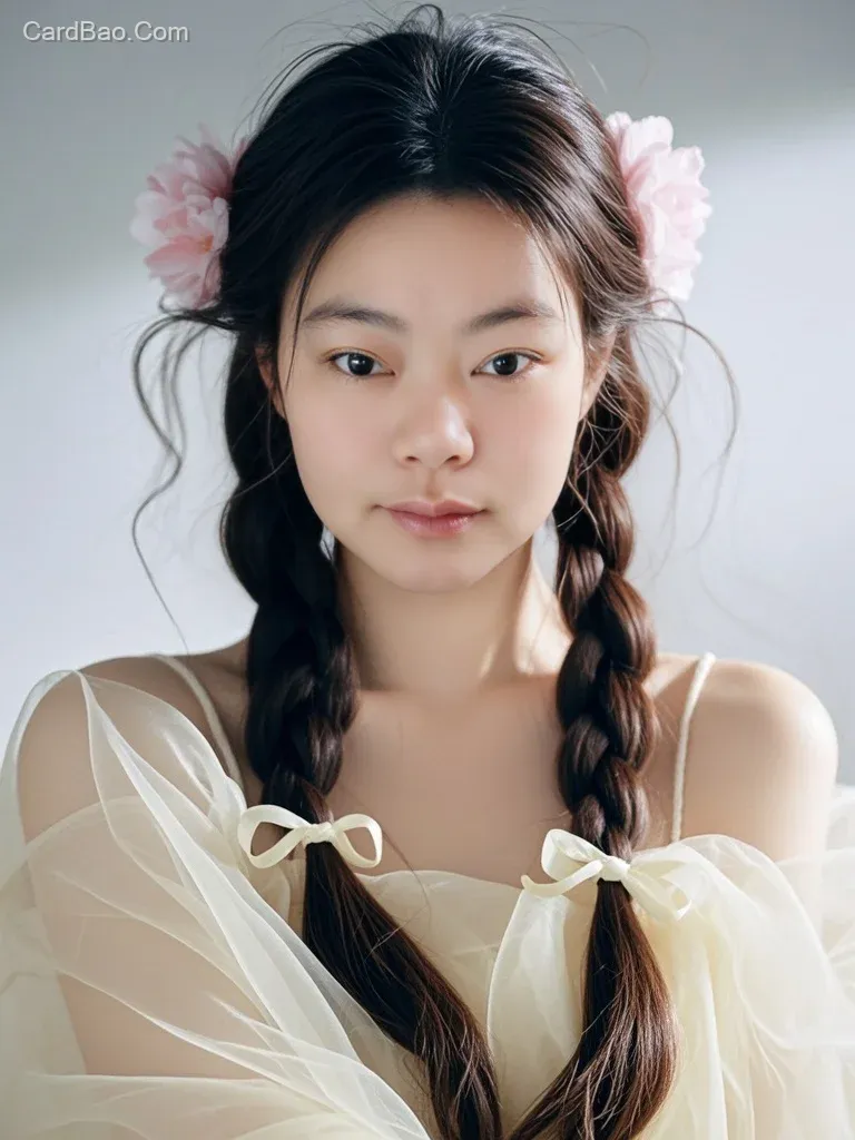 ##背景透明,大家闺秀,亭亭玉立,华丽光影 ,高雅气质,柔和灯光,超清画质,长发,浅粉色两个麻花辫,浅粉色花发饰,发光的眼睛,半身镜头,流体艺术,高细节,仙气,纱制衣服。楚楚可怜,近景,面部特写