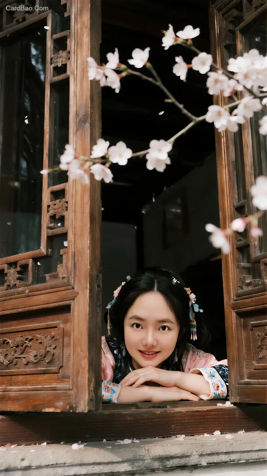 ## A delicate ancient-style beauty lazily reclines on an open carved wooden windowsill, her hands clasped together under her chin as she gazes directly at the camera. She wears ethnic attire, with fair, rosy, and slender skin, a slightly sweaty oval face, and striking features—large eyes, long lashes, soft brows, a straight nose, and pink lips—her expression gentle. Her damp, tousled hair complements her understated makeup. Outside the window, peach blossom petals drift down in a dim, monochromatic setting.