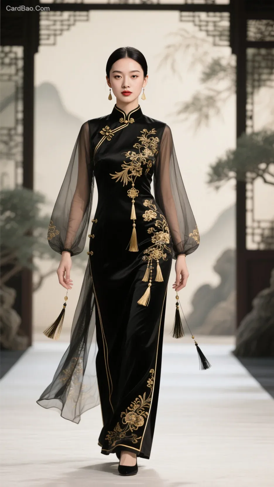 ##国风国模,T台新中式套装,旗袍上衣配长裙,黑色描金色调温润典雅。纱质衣袖添几分轻盈,精致刺绣绽东方韵味,流苏摇曳间,传统服饰与复古风交融,一步一景,尽显中式美学的含蓄与诗意 。