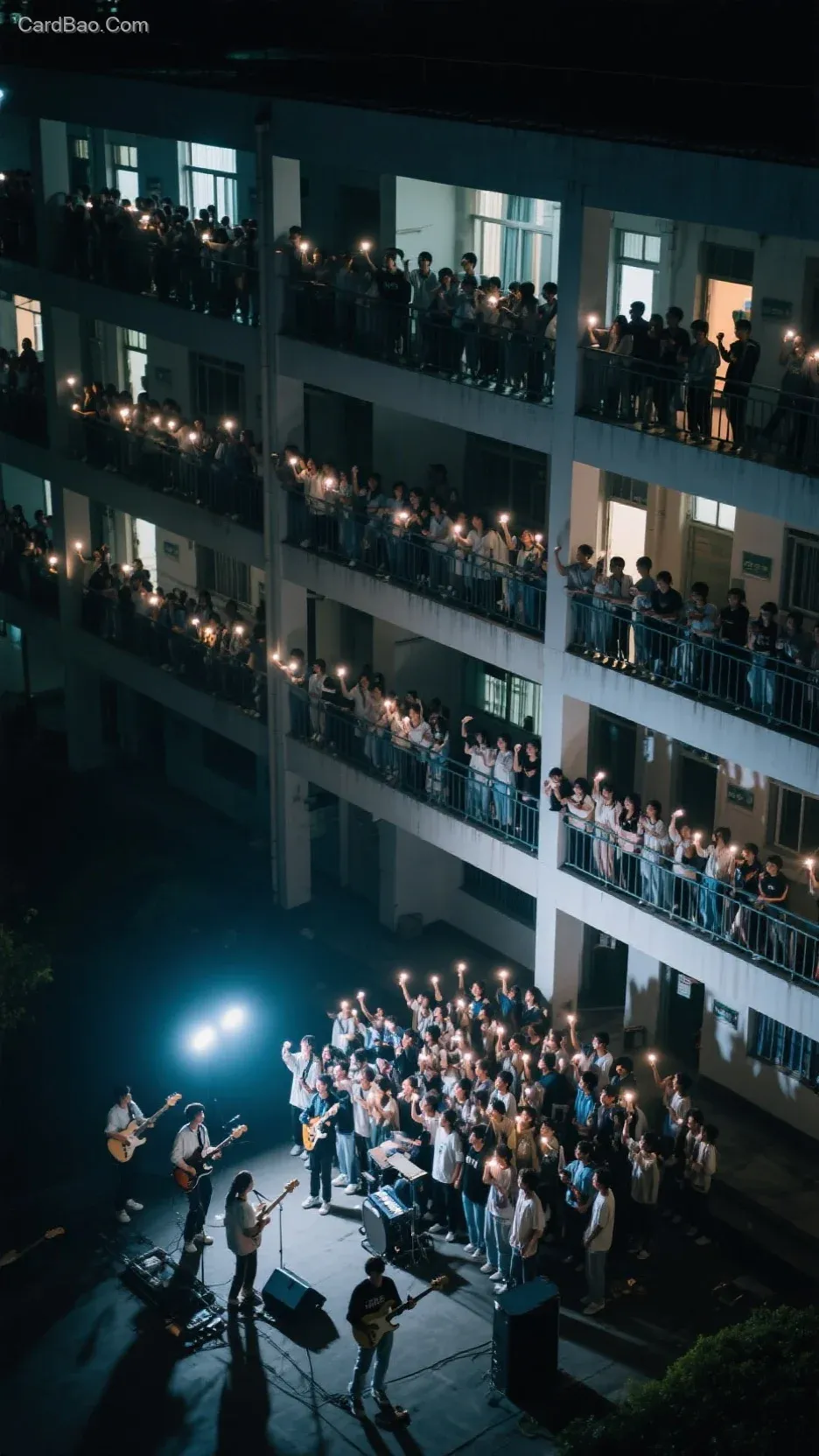 无人机角度 高中宿舍的阳台上站满了学生,外面是黑夜,学生们打开了手机灯光,一起全场大合唱 楼下 一支乐队 在弹奏