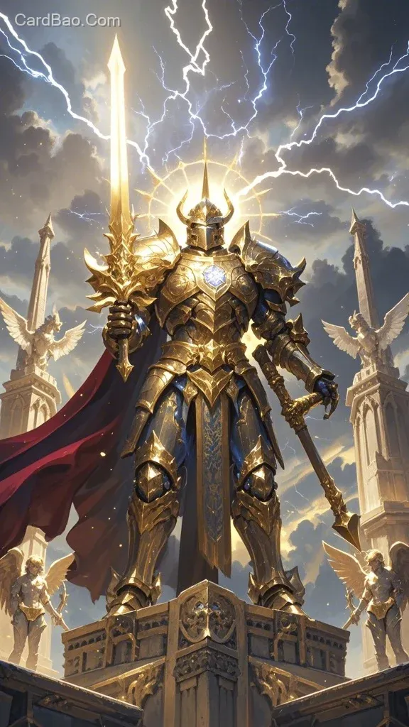 The Golden Paladin Mech stands atop the pinnacle of a spire temple, clad in intricately engraved holy armor. Its complex design meticulously details every component, while its massive hands grip a thunder-wreathed divine greatsword pointed toward the heavens.