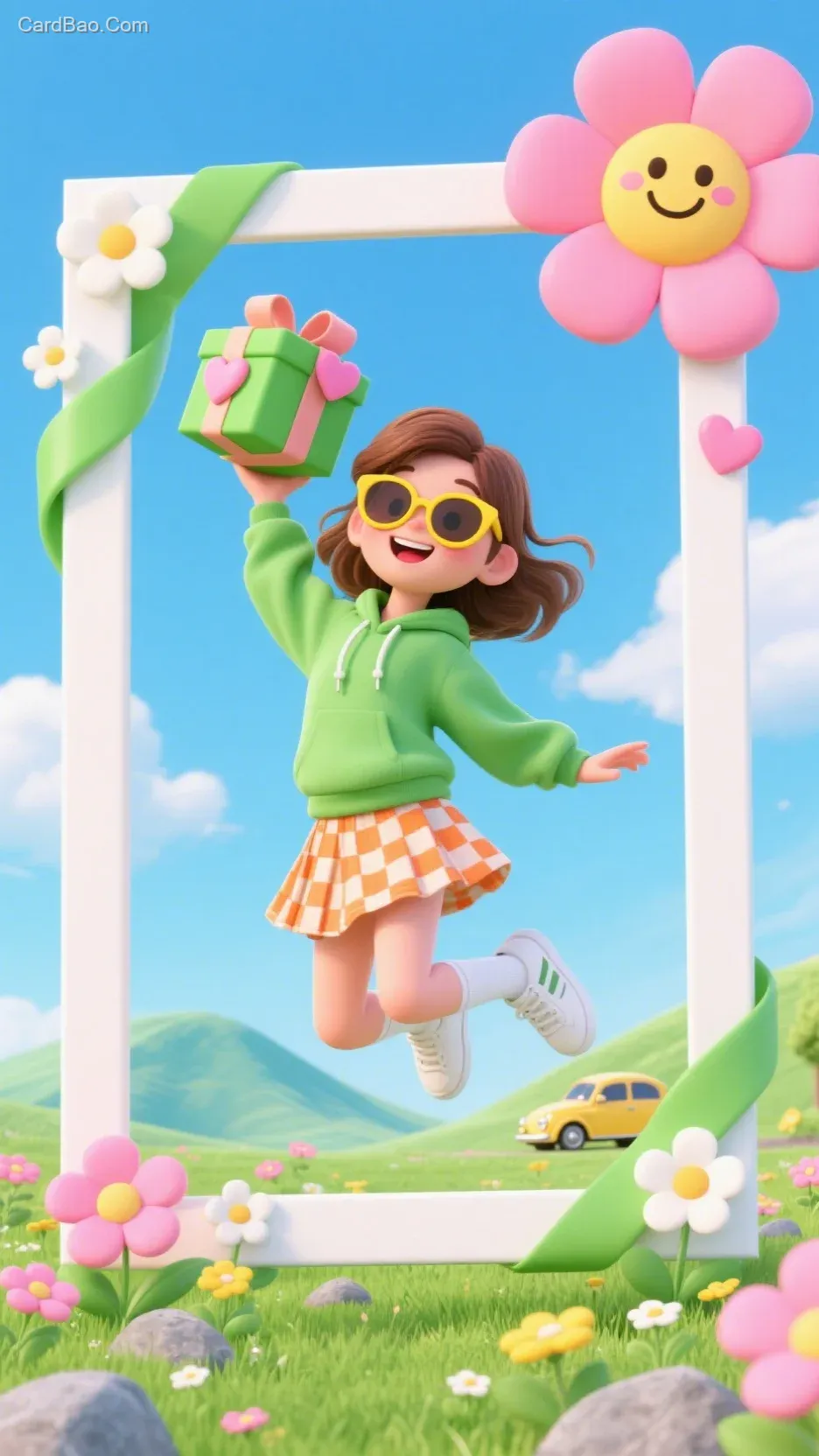 春日游主题海报,主体人物:3D 风格,一个活泼的年轻女孩,棕色头发,戴黄色墨镜,穿着绿色连帽衫、橙白格子短裙、白色短袜和白色运动鞋,面带灿烂笑容,右手高高举起一个绿色礼盒,礼盒上有笑脸和粉色小心形装饰,呈现跳跃奔跑姿态。 框架元素:白色边框相框,相框上装饰有绿色飘带、粉色花朵、白色小花、绿色和粉色爱心,右上角大粉色花朵带笑脸表情。 背景环境:春日户外场景,蓝天白云,大片绿色草地,点缀着粉色和黄色花朵、灰色石头,远处有浅绿色和浅蓝色山丘,一辆黄色小汽车停在草地上 。