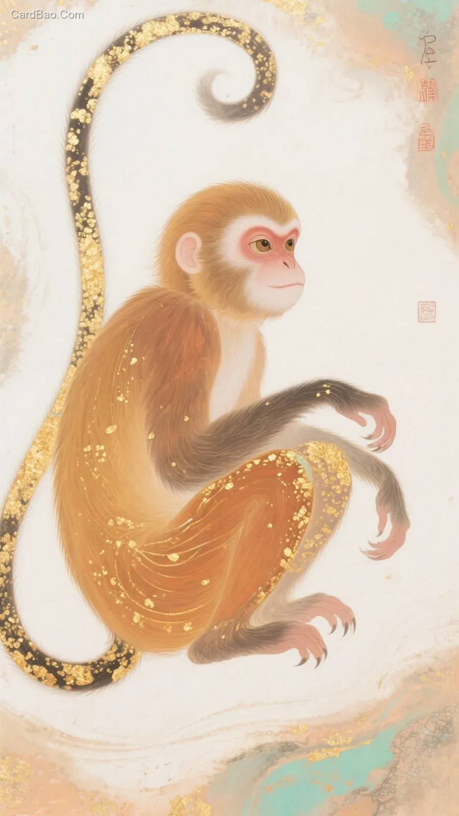 12生肖,猴,中国古典审美,岩板雕刻油画泼墨 ,岩彩板画,金箔岩彩,金箔,鎏金线条,金箔颗粒,泼彩,国风,岩彩画,工笔画,漆画,丰富色彩,肌理感,流畅婉转线条,氛围感,磨砂质感,大面积留白,写意,意境,大师作品,视觉冲击,壮观,金箔点缀,岩彩画,手绘,平面插画,中式美学,敦煌色彩,磨砂肌理质感,概念艺术,矿物颜料制作而成,强烈的色彩冲击感,金箔和金粉装饰点缀。古风意境,暖色系,朦胧,迷幻,弥散渐变,层次感,梦幻,超现实主义美学,空灵,如梦似幻,近景,极致写实油画。偏暖色系,