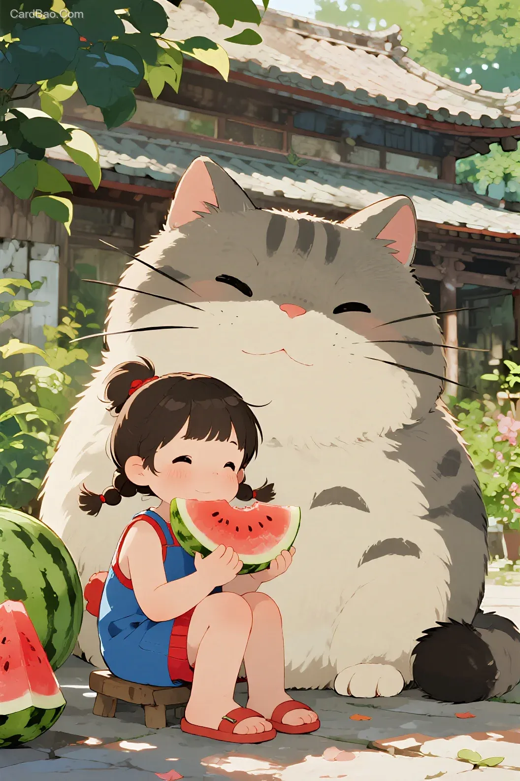 插画,画面中有一个扎着辫子、穿蓝红配色衣服的小女孩,抱着一块大西瓜,身旁是一只巨大的、憨态胖猫,背景是有绿植点缀的古朴建筑,整体氛围温馨、美好,传递出夏日的闲适与童真