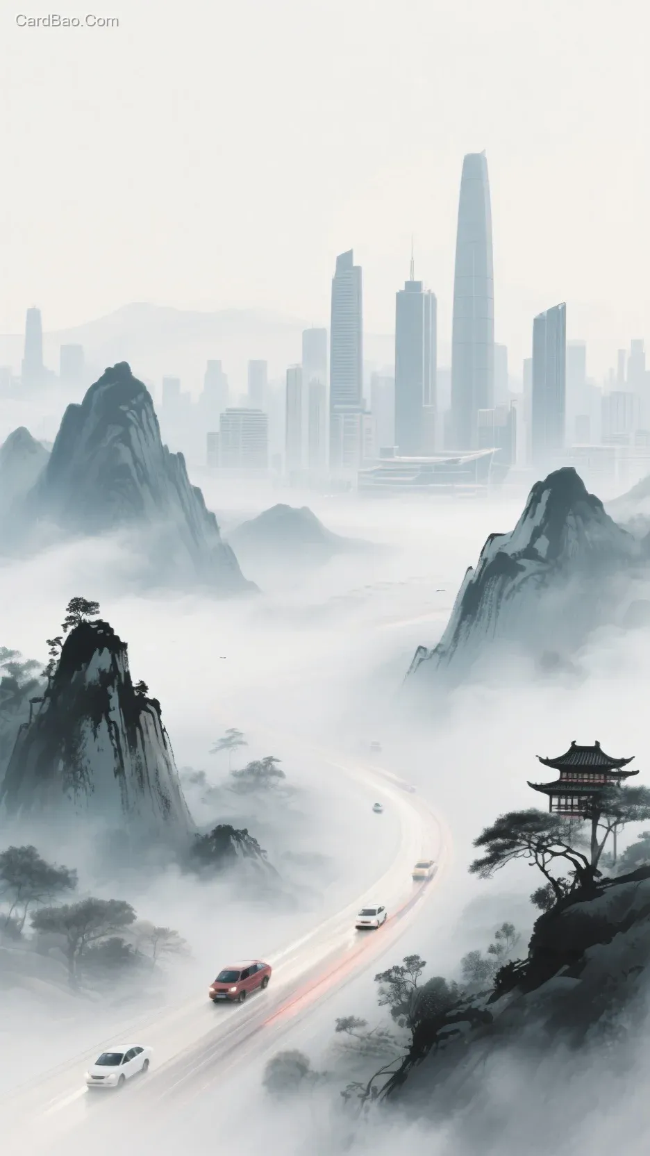 城市山水, 现代与传统, 烟雾缭绕, 流动车流, 建筑山峰, 环境寓意, 水墨天际线, 都市写意。