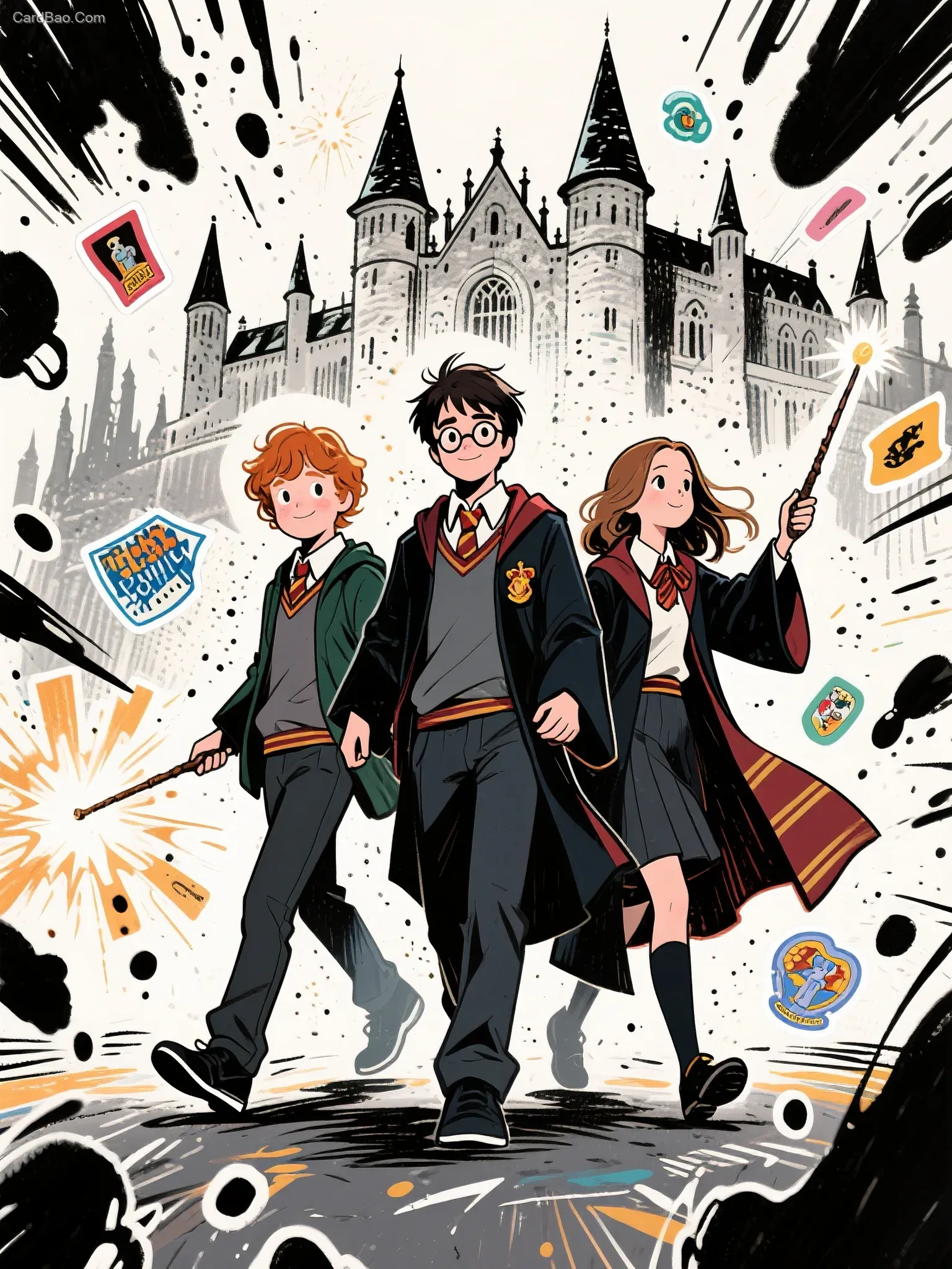 《哈利波特》三人组,从左到右分别是罗恩,哈利波特,赫敏,全身,穿着魔法袍,拿着魔法棒,背景是霍格沃茨城堡,马克笔风格,涂鸦风格,二次元画风,粗糙颗粒感,墨染,流体,光影效果,爆炸式布局,贴纸风格,动感,画面感,动态效果