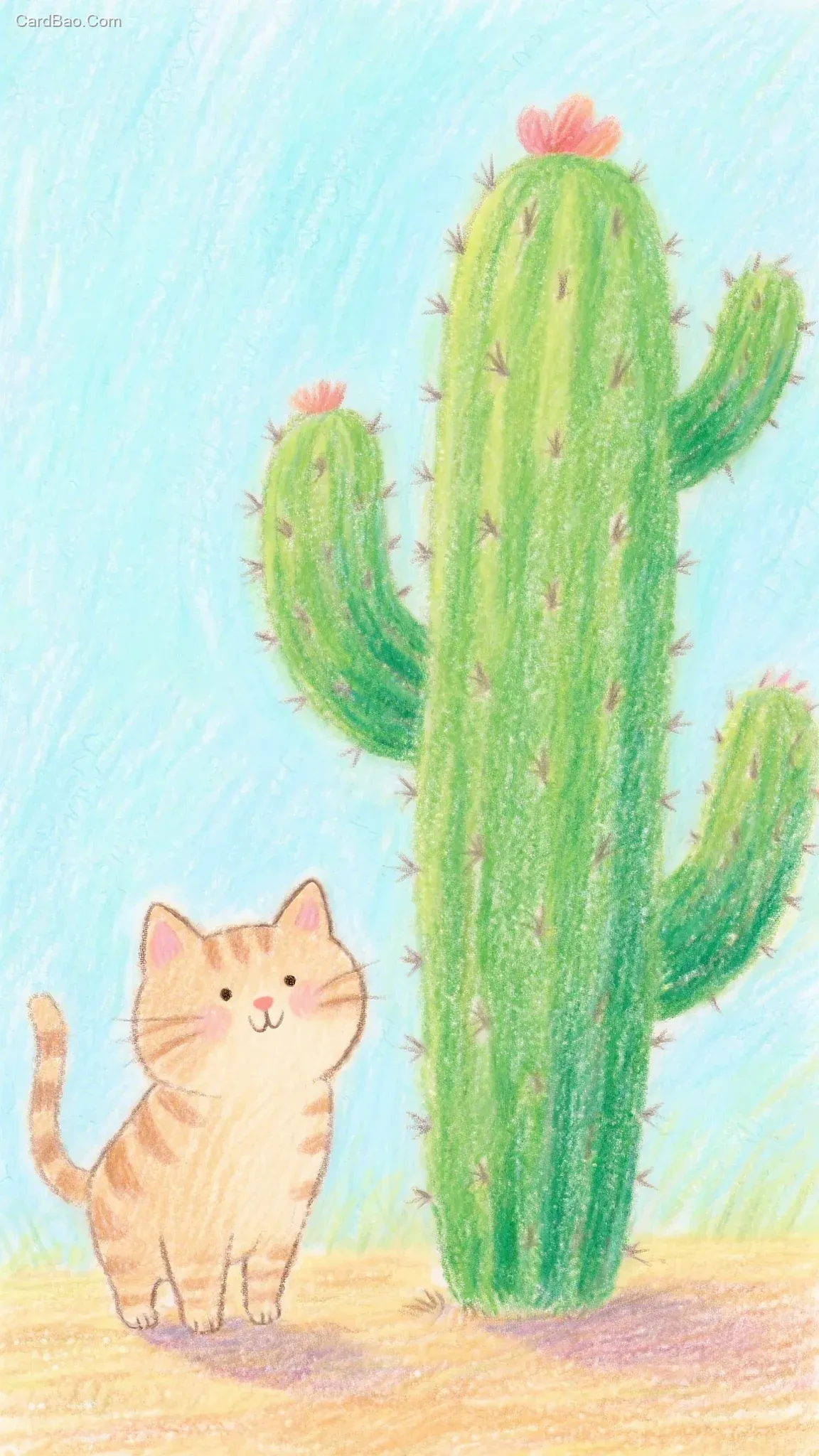 儿童插画,彩铅,绿色仙人掌,浅棕色小猫站在地上,明显笔触,颗粒感,童真,唯美