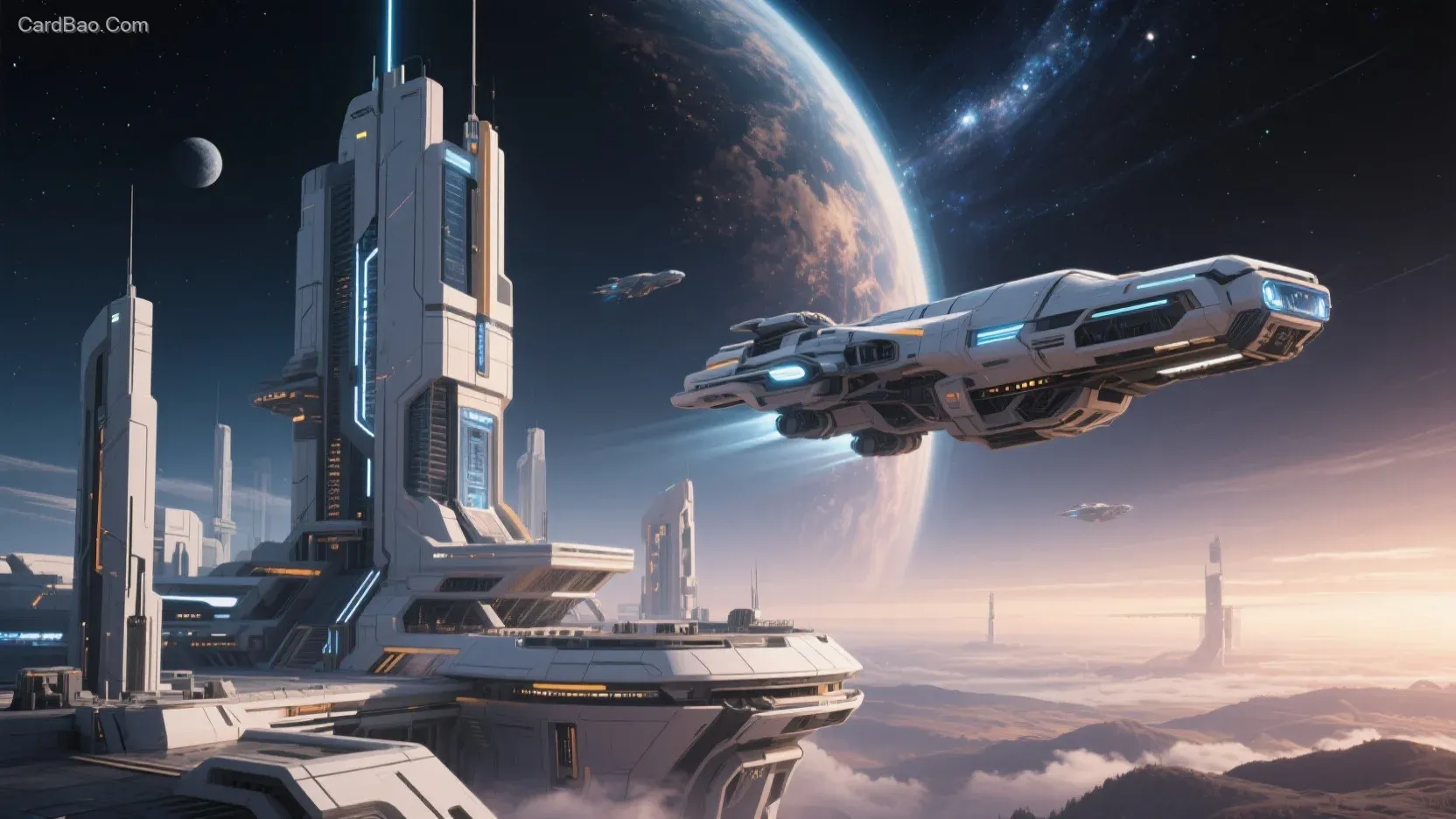 未来高科技建筑与飞行器,宇宙星空背景,科幻风格,远景,科技感十足,震撼