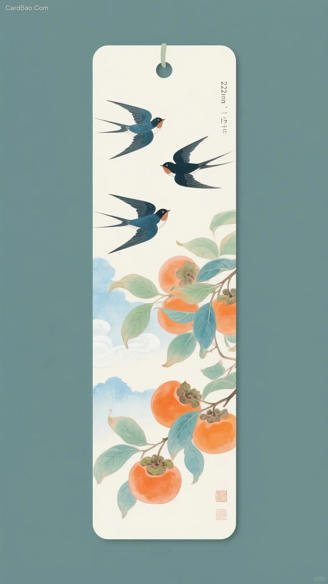 Bookmark pattern design, vertical and slender bookmark with dimensions of 22mm in width and 109mm in length. The elements on it include numerous orange persimmons with light green leaves, three gracefully posed little swallows in blue gradient hues, faint clouds, all combined into a decorative art-style composition.
