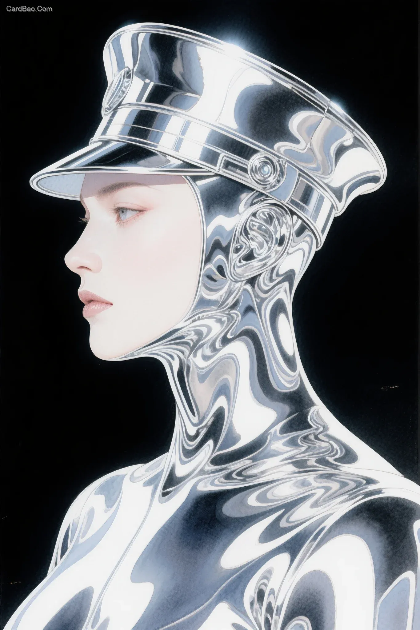 Silver metallic aesthetics, flowing metal, liquid silver, futuristic style, futurism, wearing a metal-decorated hat on the head, rim lighting, bright retro, retro-futurism, high contrast, pure black background, highly reflective metal, strong reflections, minimalism, high-end, highly imaginative visuals, futuristic vibe, futurism, sci-fi movie, psychedelic, watercolor painting.