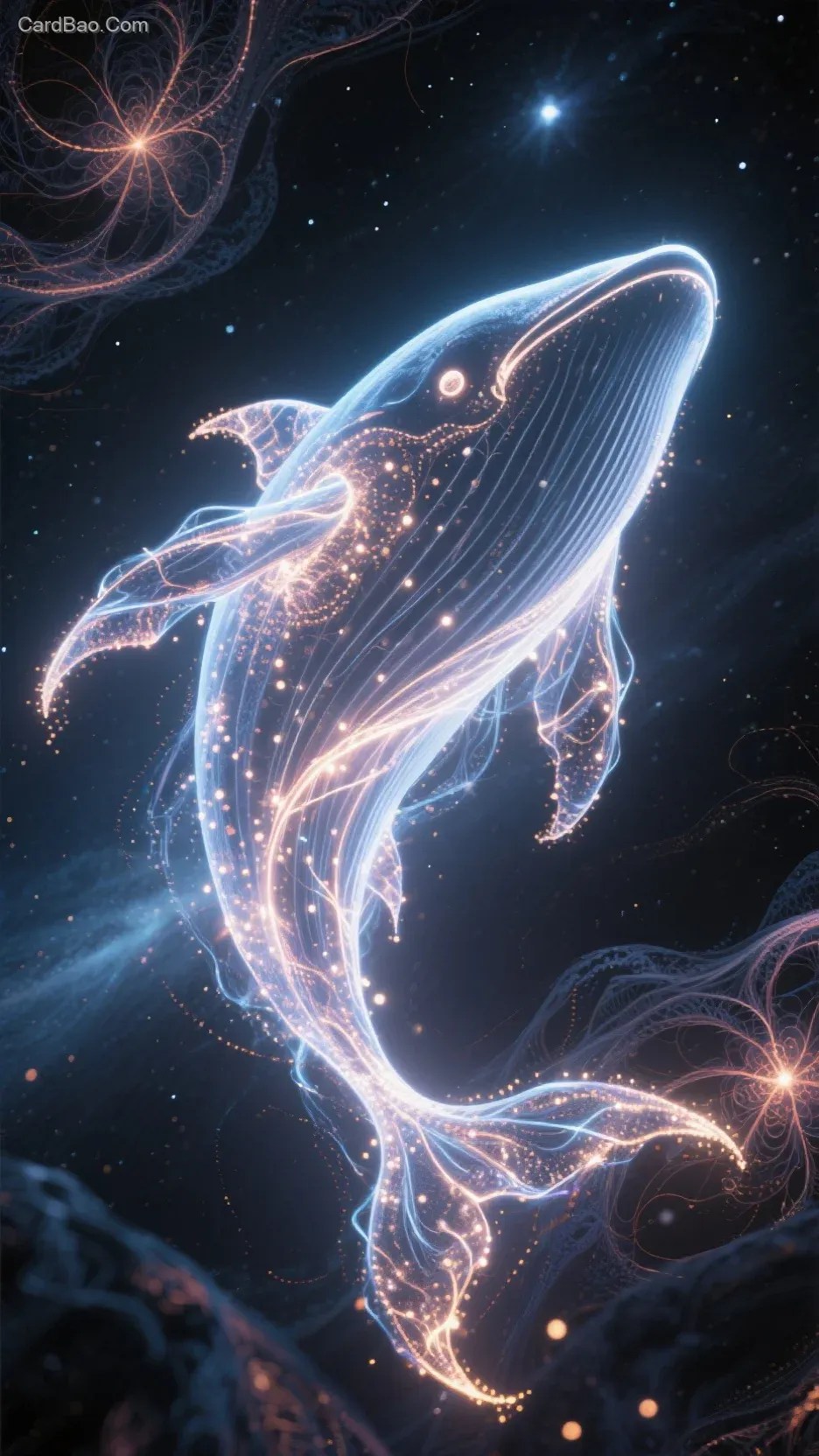 宇宙空间中,用分型算法和混沌算法,创造一个由发光粒子流动形成的线形成的巨鲲,随机的,混沌的,开启阴影投射,高清图片,大师作品