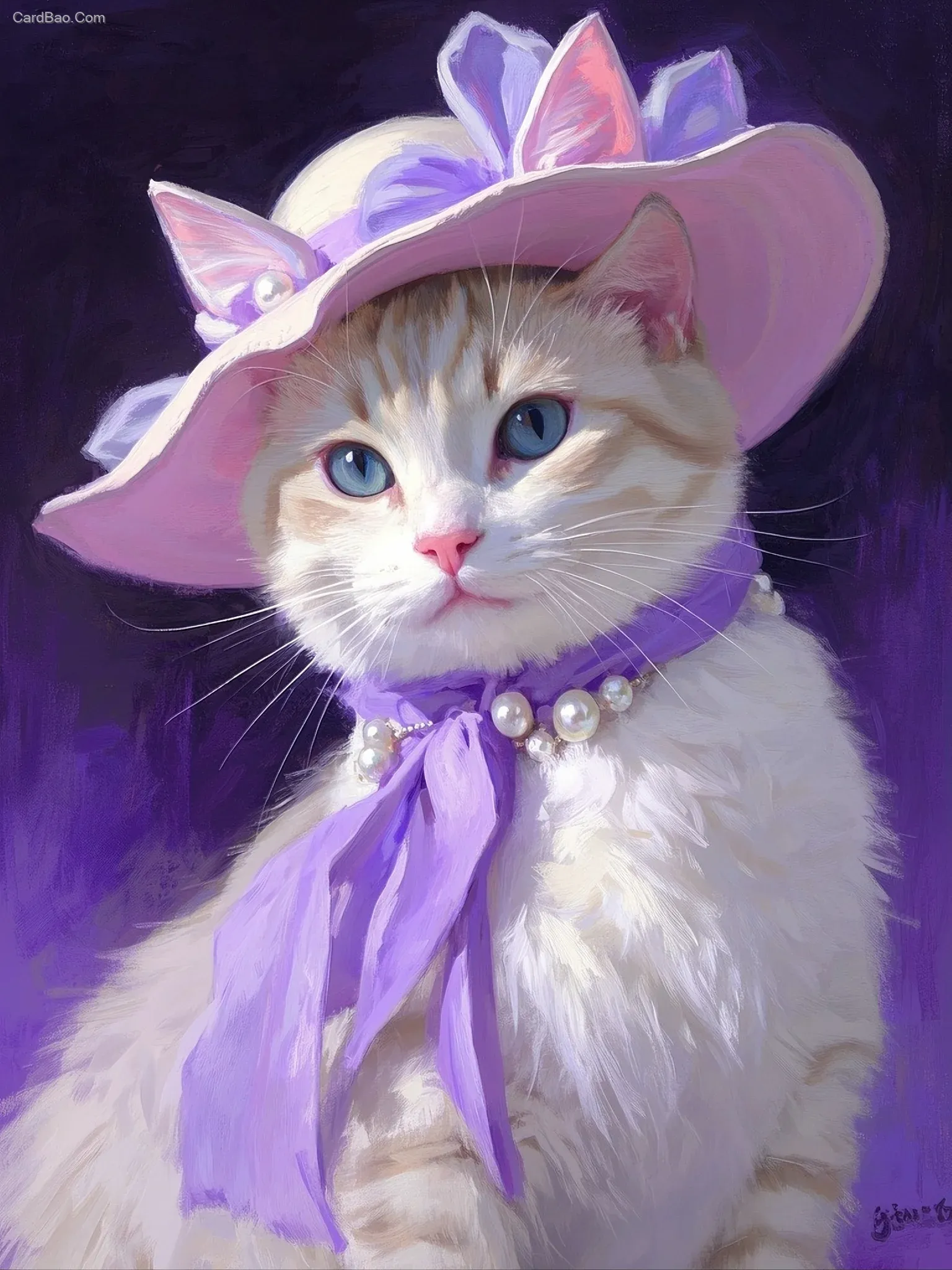 一幅写实风格的数码油画,描绘了一只浅色系的猫咪,头戴别致的浅粉色宽檐帽,系着精致的浅紫色围巾,身着飘逸的浅色调连衣裙。猫咪还佩戴着优雅的珍珠耳坠。背景是深邃浓郁的紫色,柔和自然的光线增强了纹理和细节,营造出精致迷人的氛围。