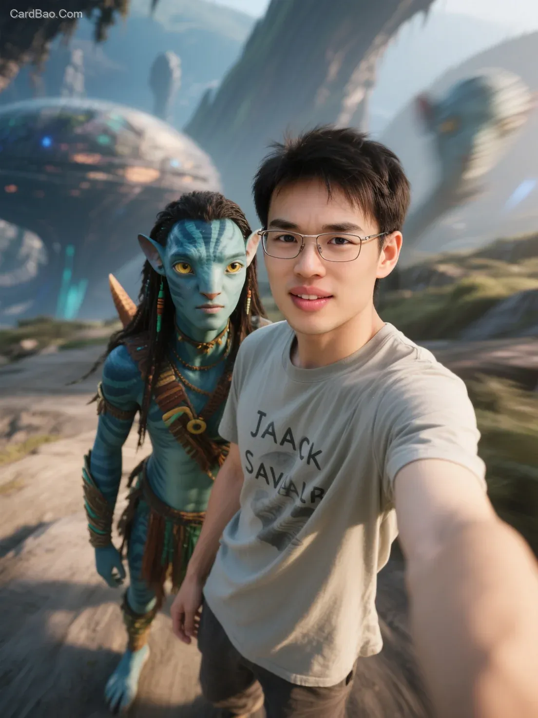 ##生成一个极其平凡无奇的自拍照,无明确主体或构图感,随手一拍的快照,照片略带运动模糊,打光不均导致轻微曝光过度,整体呈现出一种刻意的平庸感,像是漫不经心的自拍。主角是一个20 岁的中国男子,旁边是阿凡达主角杰克萨利,主角第一人称视角合影自拍,在阿凡达星球