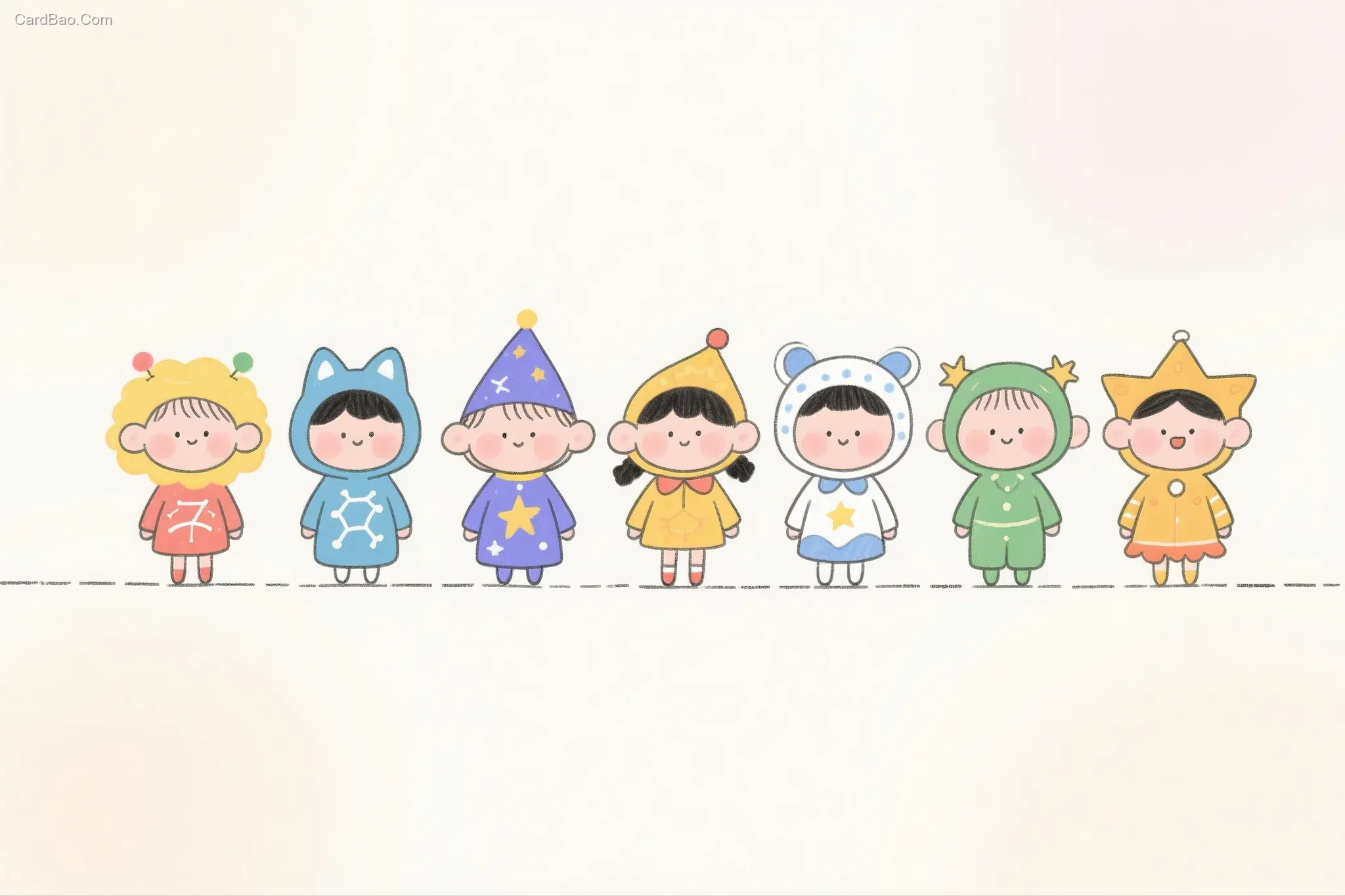 手绘插画,简笔画,一排可爱的穿着不同星座服装的小朋友头像横向排列在一条直线上,萌系,治愈,充满童趣和想象力,超细节,背景极简,浅色晕染,高清32K,多巴胺配色