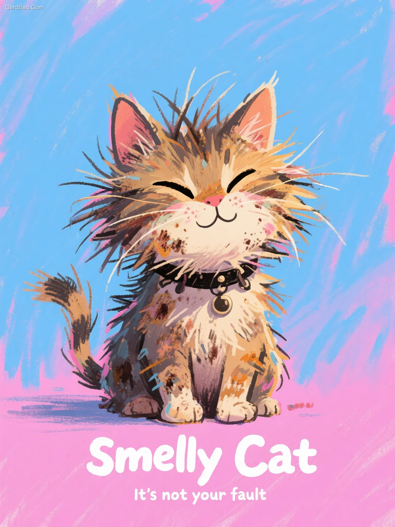 创意艺术插画,趣味,诙谐,非常有趣的朋克风猫咪,猫咪炸毛,乱乱的,脏脏的,儿童涂鸦,有机笨拙的笔触,大胆的绘画风格,儿童画,分层纤维、蓝色和粉色,概念,CG艺术,文字标签“Smelly Cat”在画面底部,副标题:“It's not your fault”简约,高级,杰作