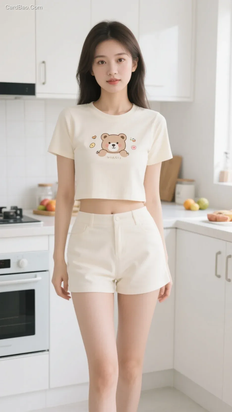 - 上衣:是一件浅色系的短袖短款上衣,颜色为米白色,款式简约时尚。衣服上有可爱的卡通图案,图案主体是一只小熊,周围还有一些小元素点缀,增添了俏皮感和趣味性,整体风格甜美可爱,适合年轻女性穿着,尤其是在休闲或居家的场合。
