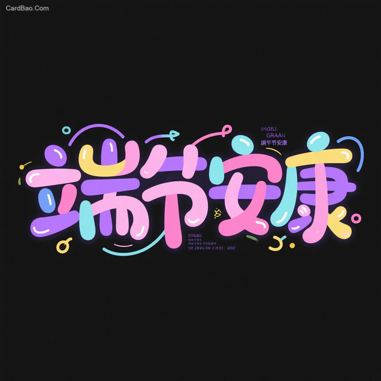 “端午节安康”字体设计,点缀笔划,色彩多种,穿插在字体笔画中,可爱体矢量插画,标志,黑色背景,创意字体设计LOGO,线条流畅且富有艺术感,中文"端午节安康"设计灵感:将字体进行抽象变形,创造出独特的节奏和动感,高级感,扁平化,大师作品