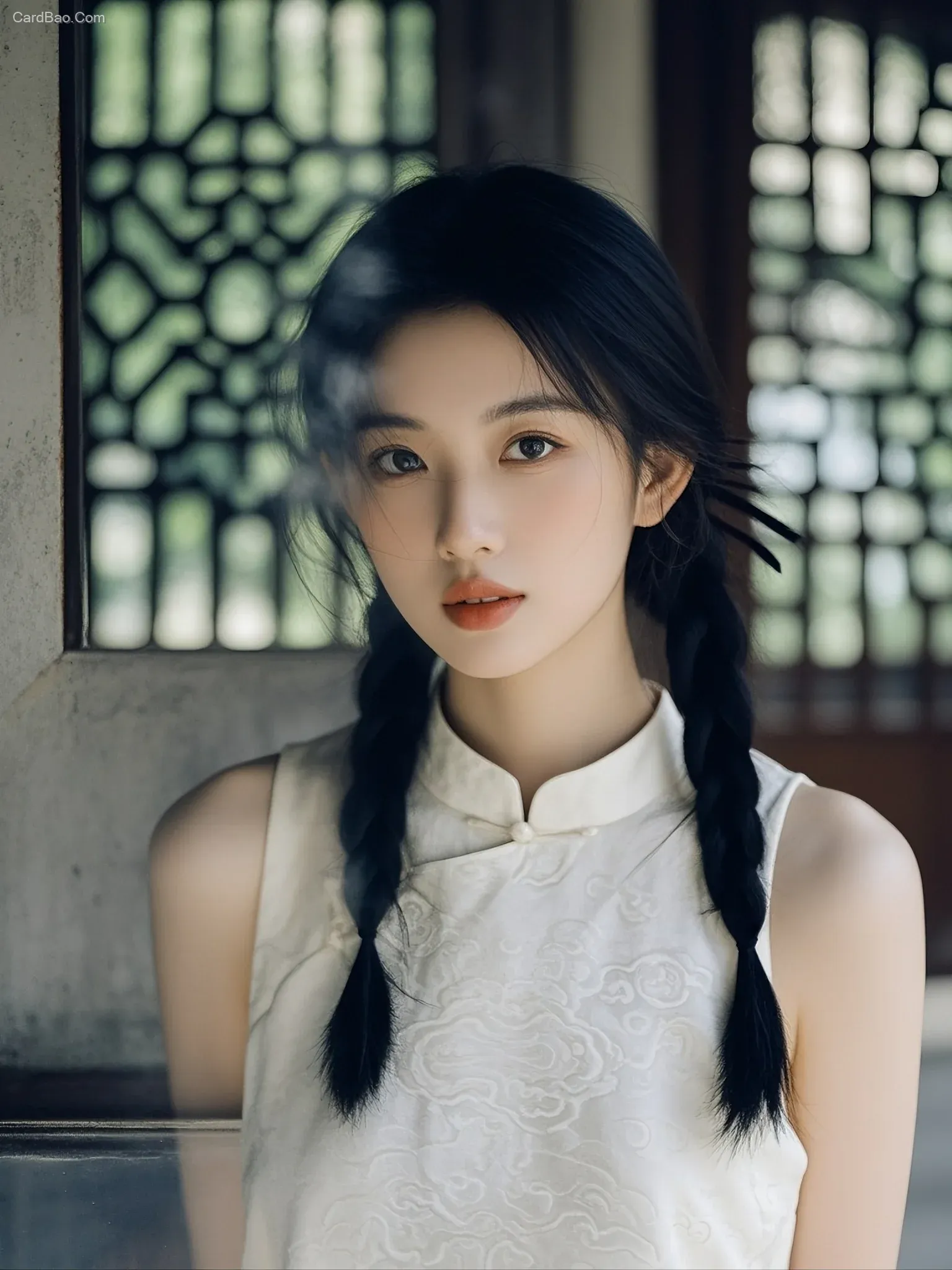 Blurred, hazy aesthetics, overall soft and diffused blur, lattice windows, mottled walls, auspicious cloud patterns, medallion patterns, ruyi patterns, abstract, empty space, faintly blurred portraits, motion blur, edge blur, dark and moody, multiple exposure, out of focus, ultra-wide angle, strong perspective, depth of field, high noise, intense film grain, dynamic aesthetics, diffuse blur and smudging, exaggerated composition, surreal, vivid and flawless details, masterpiece, close-up out of focus, gaze, eyes, woman, long black braid, wearing loose beige sleeveless top and bottoms, overall classical and artistic style, full of Eastern charm.