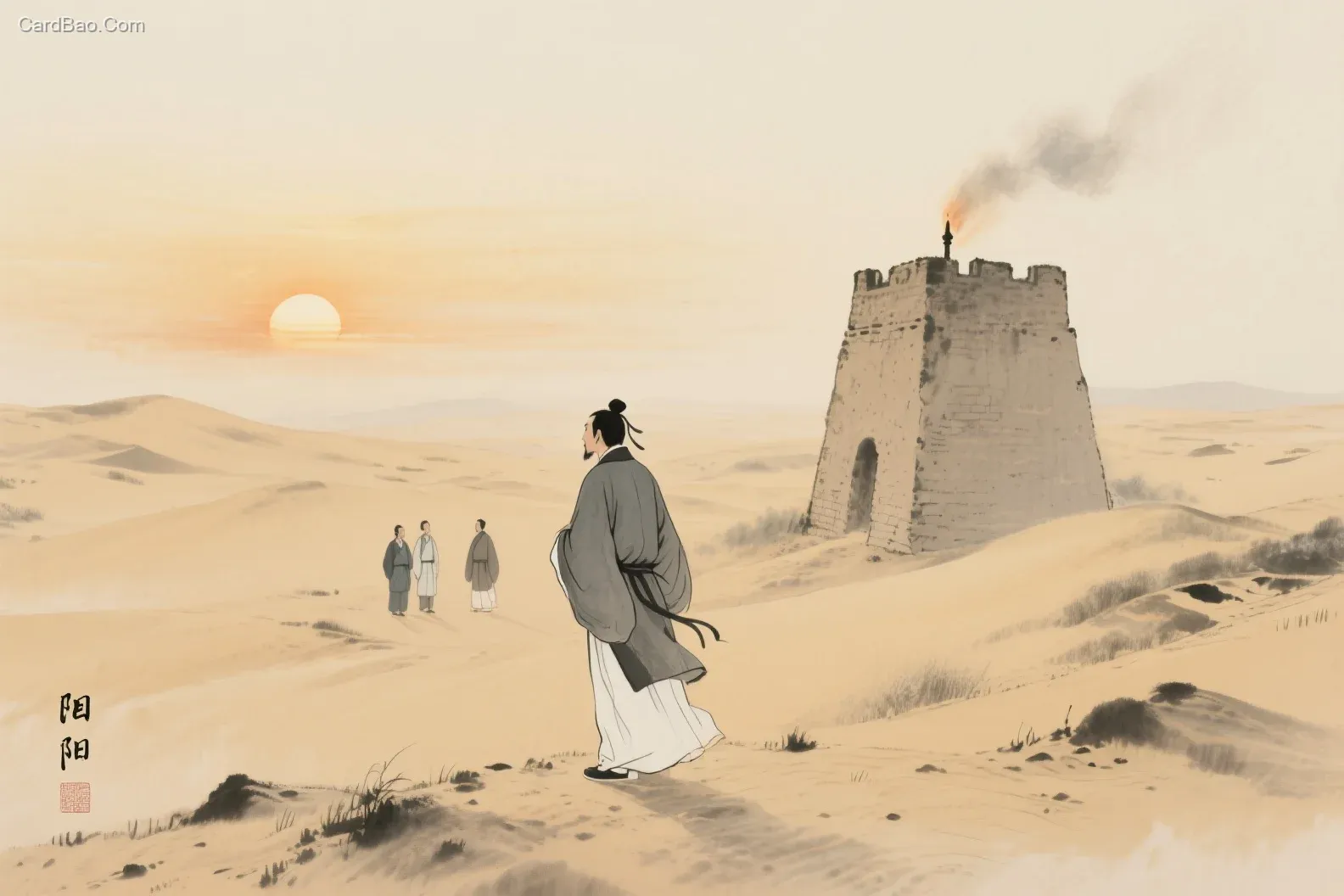 一位身着古装的男子在阳关之外的荒漠中转身作别友人,黄沙漫天,远处夕阳残照,烽火台孤独矗立,古诗意境插画,中景,离别伤感氛围,苍凉,画面富有诗意