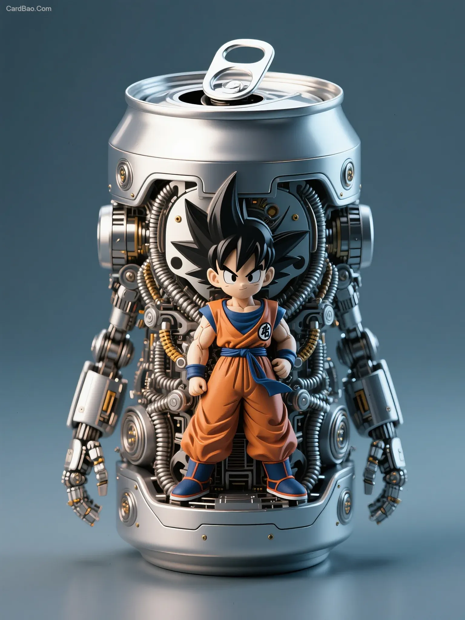 A massive mechanized soda can, mechanical structure, precision machinery, with a prominent mechanical 3D sculpture of young Goku from Dragon Ball carved on it. The main character is colored, packaging design, artwork, highlighting the soda can, solid color background.