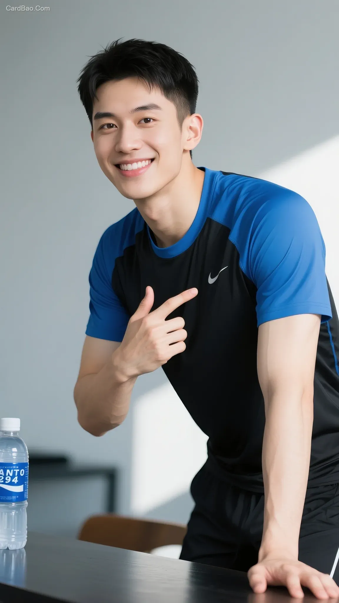 10. Wearing a blue-black color-blocked sports T-shirt (Pantone 2945C + Black)