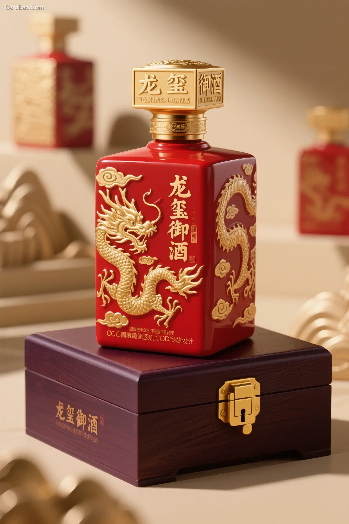 一款中国的高端白酒包装设计,红色瓷瓶,方瓶满布祥云盘龙浮雕,金色瓶盖复刻传国玉玺造型刻有"龙玺御酒"篆字,紫檀木外盒配黄铜锁扣,三维立体建模展示,不同角度,大师作品,OC高级渲染,3D(C4D)效果,