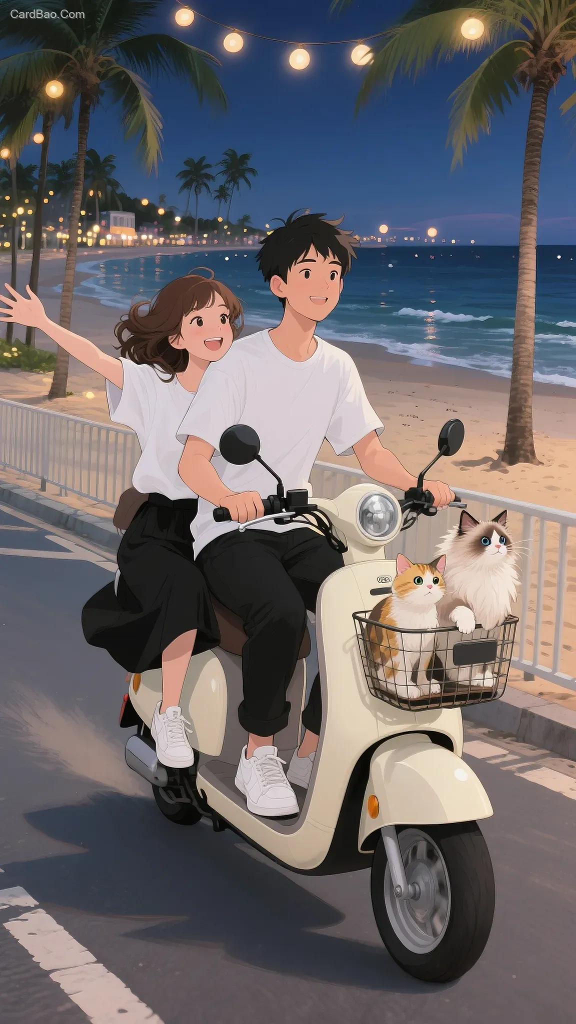 Anime illustration style, a summer night in a coastal city, featuring a lively young couple around 20 years old. The girl has shoulder-length, slightly wavy dark brown hair, wearing a loose white T-shirt and a black long skirt paired with white sneakers. The boy is dressed in a white short-sleeve shirt and black pants, riding a beige electric scooter with the girl sitting behind. The girl joyfully spreads her arms, exuding happiness and relaxation. In the scooter's front basket are two cats—a fluffy, round adult Ragdoll cat and a small long-haired golden calico cat. The close-up shot captures them riding along a road lined with railings, with a vast stretch of sandy beach and the ocean in the background. Numerous ambient lights and coconut trees create a serene and soothing atmosphere, conveying a sense of leisurely relaxation after a busy day.